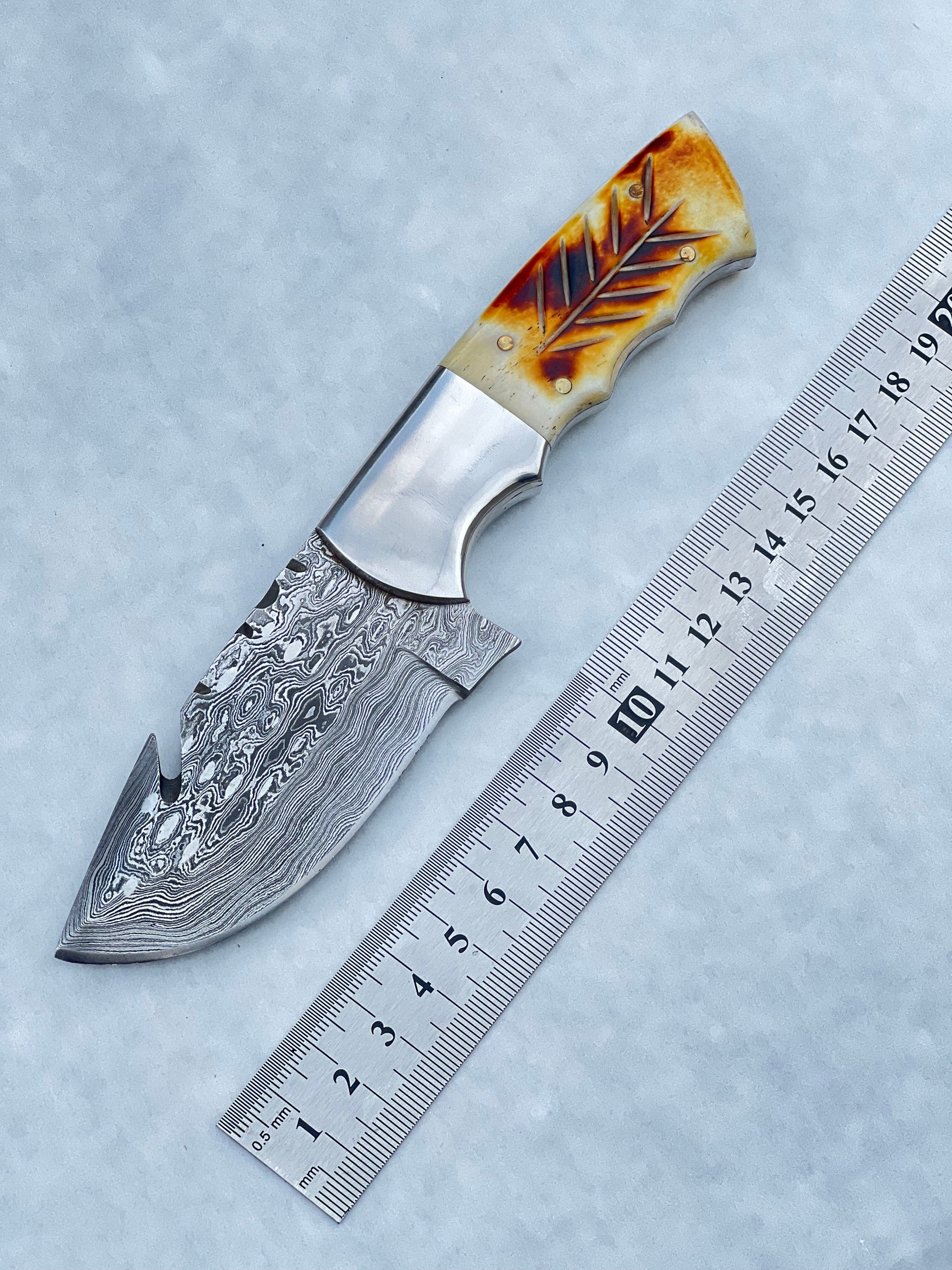 Elevate your collection with this custom Damascus steel fixed blade knife, featuring a stunning camel bone and rosewood handle. At 7.5 inches, this knife is perfectly balanced for both practicality and aesthetic appeal, making it a standout piece for any enthusiast. The razor-sharp Damascus steel blade ensures superior cutting performance, while the elegant camel bone and rosewood handle provides a secure, comfortable grip. Complete with a handcrafted leather sheath, this knife is not only a functional tool but also a perfect gift item for anyone who values quality and craftsmanship.