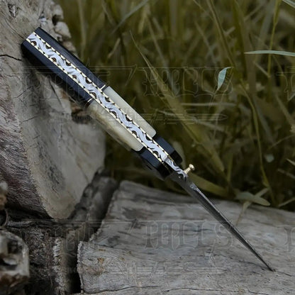 Handmade Damascus Steel Folding Pocket Knife - Damascus Bolster with Camel Bone & Resin Handle