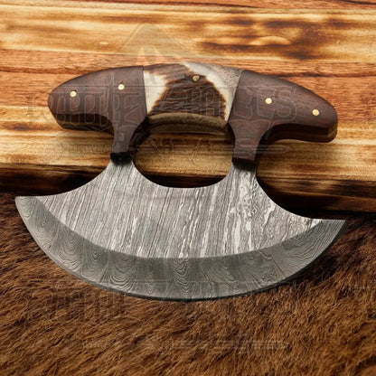 Handmade Forged 6" Damascus Steel Pizza Cutter Rocker Knife with Non-Slip Stag Antler & Wooden Handle, Premium Food Salad Chopper Knife