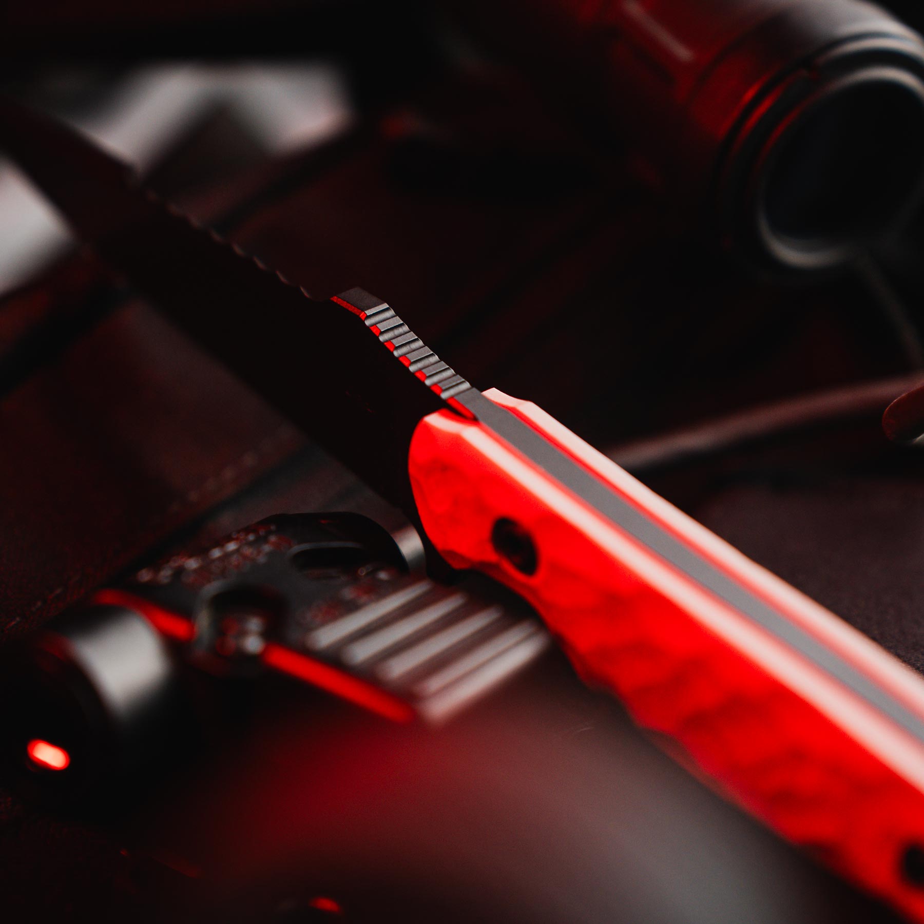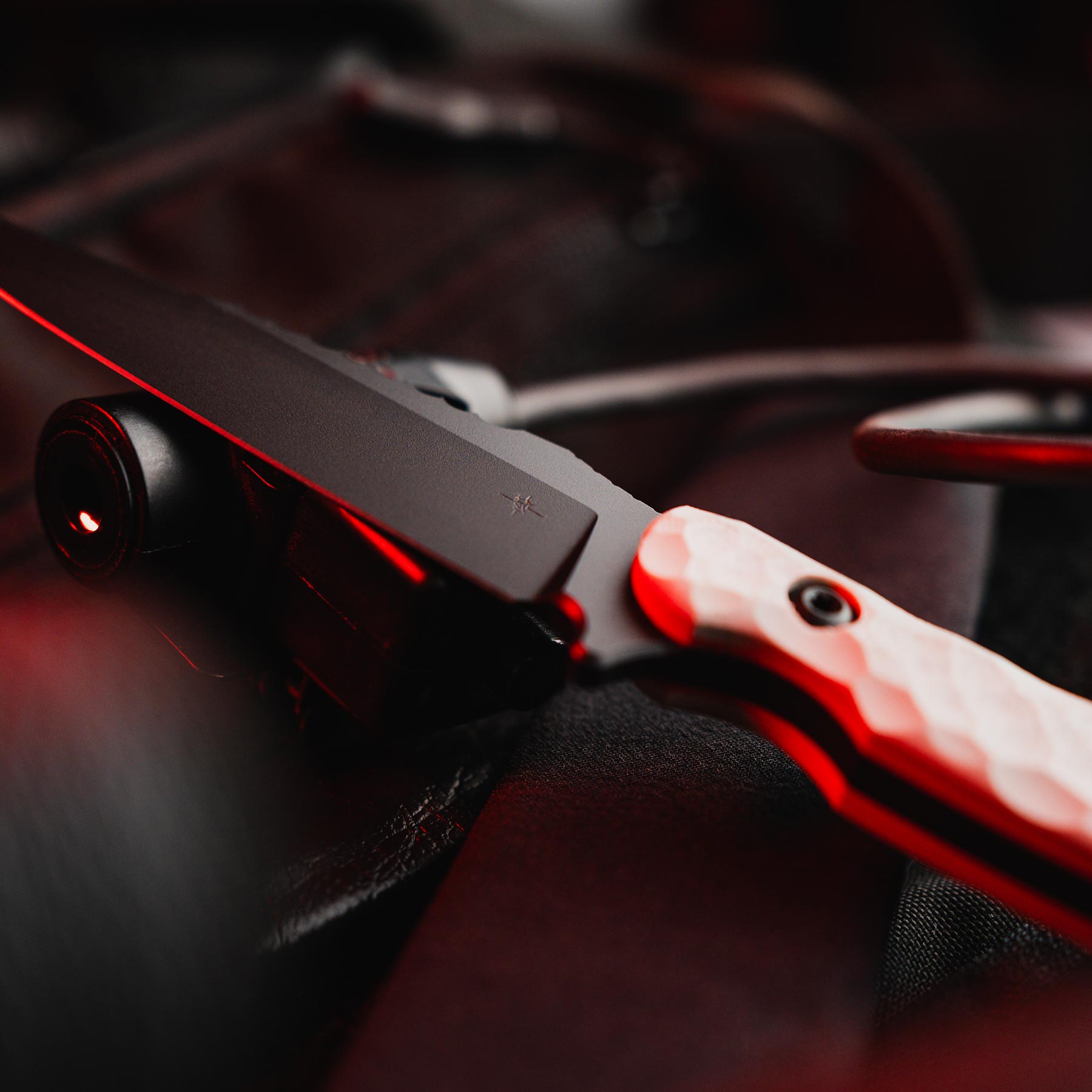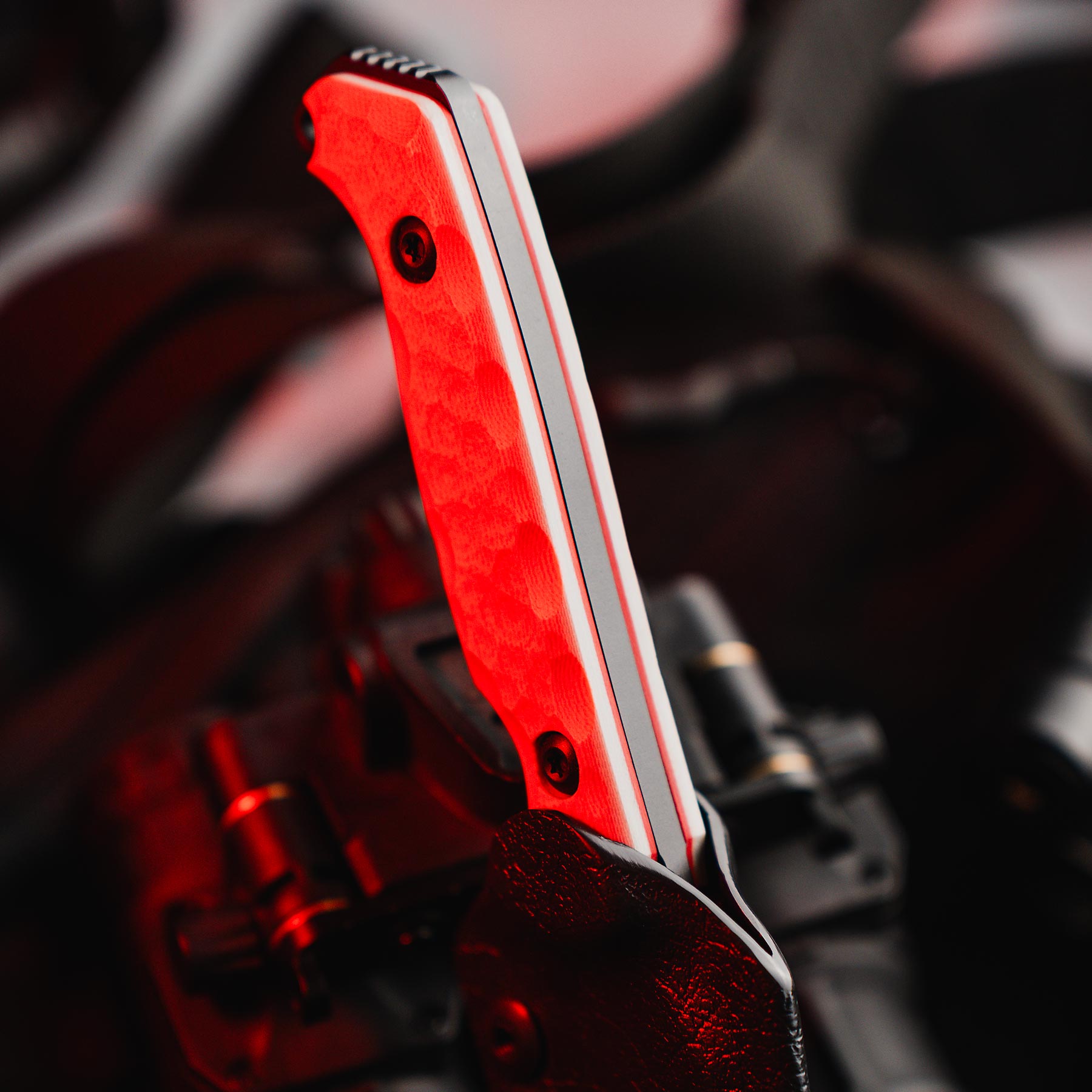 Constructed out of CPM M4 steel and heat-treated to approximately 60 Rockwell, the Darter is stout enough to tackle any task. This variant of the knife is fitted with a Grey G10 handle and Red liners, and it's machined with a texture to match the Darter Dragonfly’s wing pattern, while simultaneously providing excellent grip when operating in wet conditions.