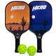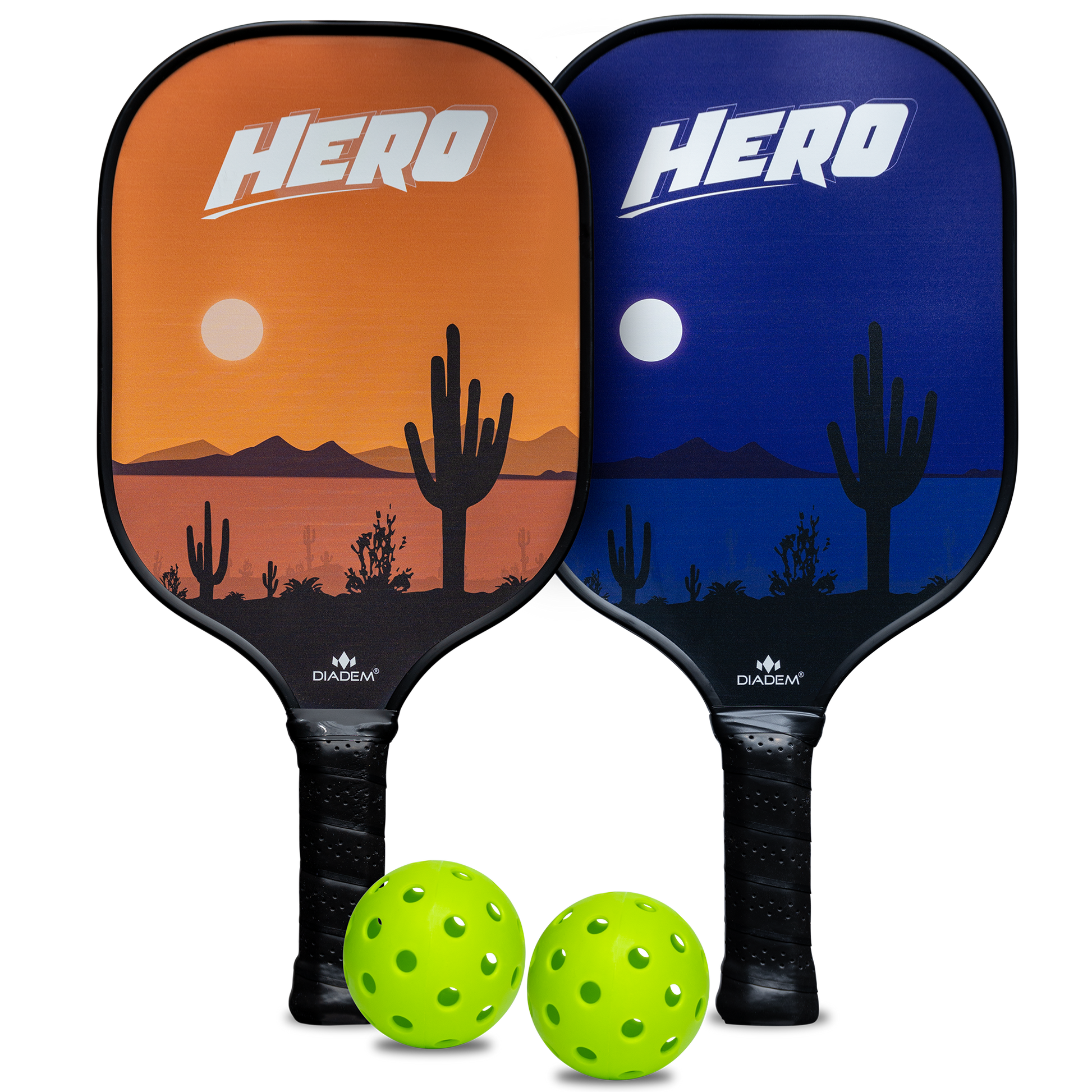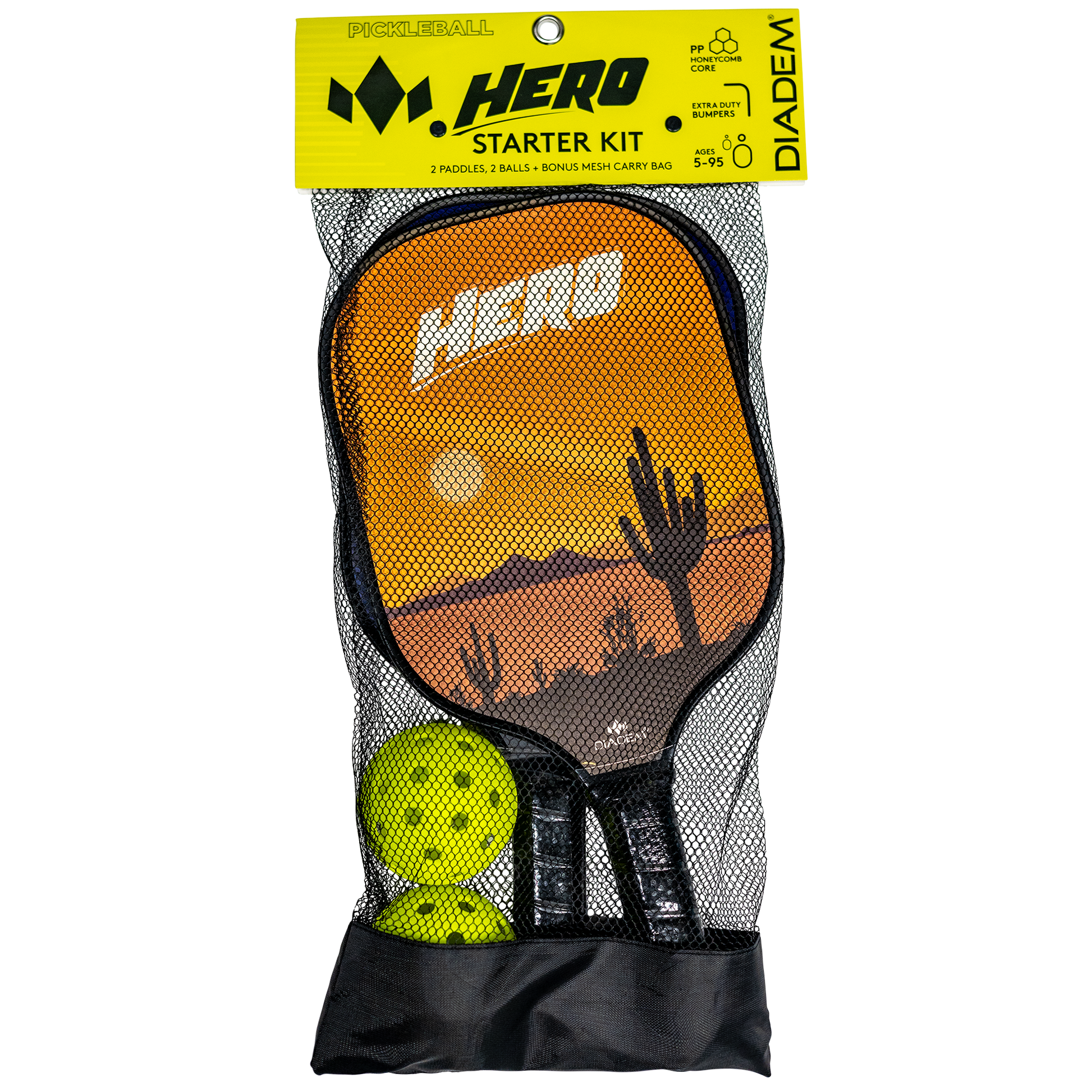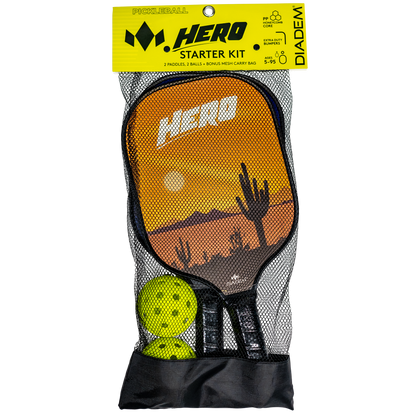 The DIADEM HERO STARTER KIT is the perfect bundle for the first time pickleball players. Included is everything you need but the court. Two Hero Paddles and 2 pickleball balls plus a mesh bag. Its wide face gives you the maximum surface area to contact the ball as you are learning. Utilizing the same HMT fiber as our Riptide line, the Hero is light weight and easy to swing. The thicker bumper prevents damage during your learning days on the court. At .55 in thick and 8mm honeycomb core, power will be easy to come by. The next pickleball champion starts here.
