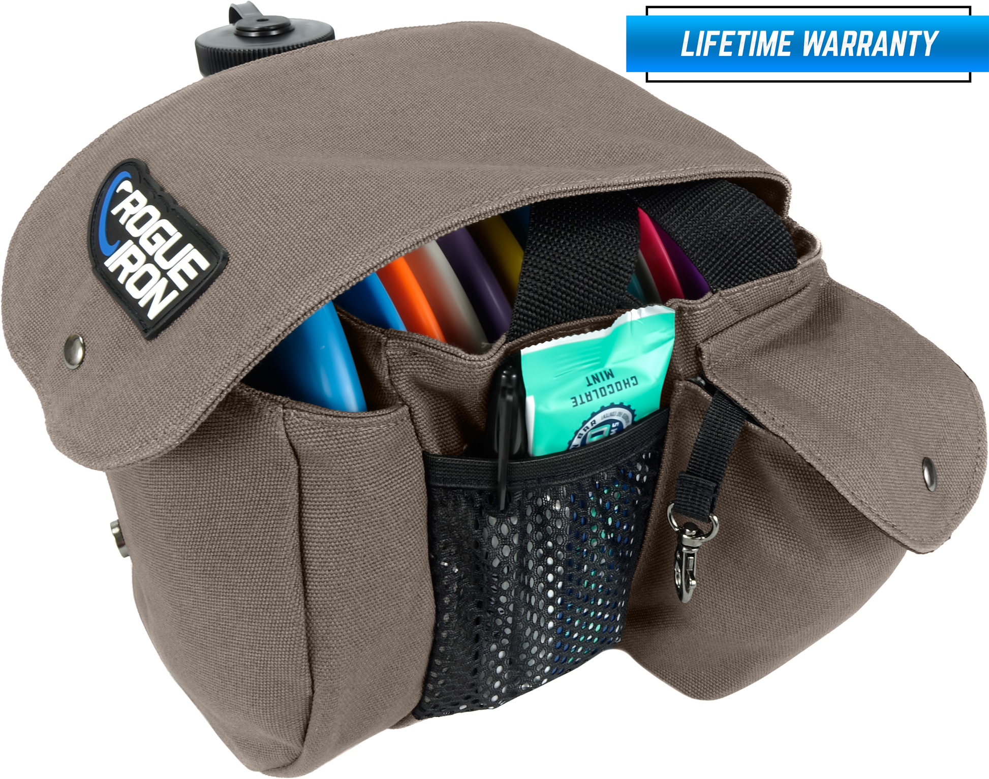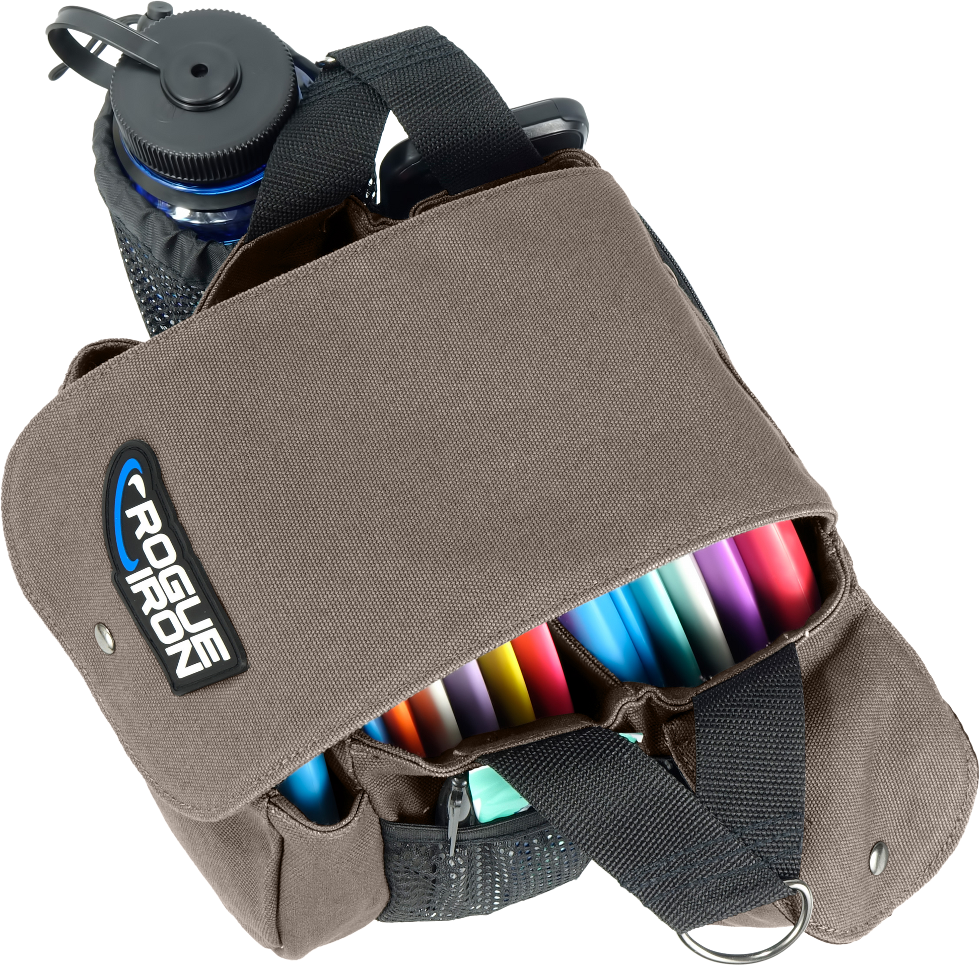 This Double Sling Bag has so many updates from the original that we don't even know where to to begin. When designing this minimalist disc golf bag we left no stones unturned. The bag is made to accommodate disc golf players of all ages and skills levels. If you are just starting out, this bag is perfect as it will take a lot of time and practice to start throwing more than a few discs. As a pro, sometimes you don't feel like hauling all 25 of your discs with you. With the Rogue Iron Double Sling Bag, you can hold up to 14 discs (an array of putters, mid ranges and drivers) a small or large water bottle (even a 32oz Nalgene) and your keys and phone during a round of disc golf. The best part of all is that it has collapsible pockets. Not taking too many discs, just collapse the pockets.