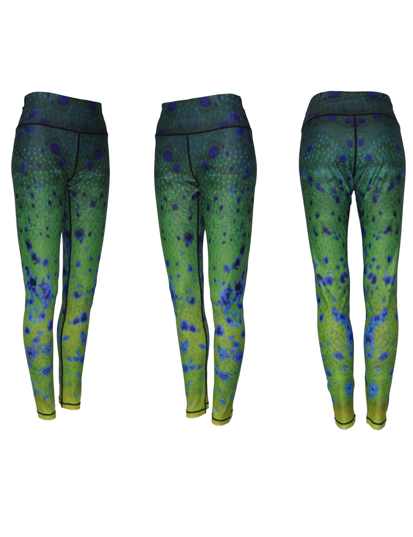 Our Dorado skin print on a performance yoga-style legging. We make the best women's fly fishing clothing available. Wear as wader liners, long underwear, workout leggings, or to get fishy for a night on the town. Our fly fishing apparel works well as hiking clothes on the trail or as a base layer for active sports. Moisture wicking apparel with great sun protection.