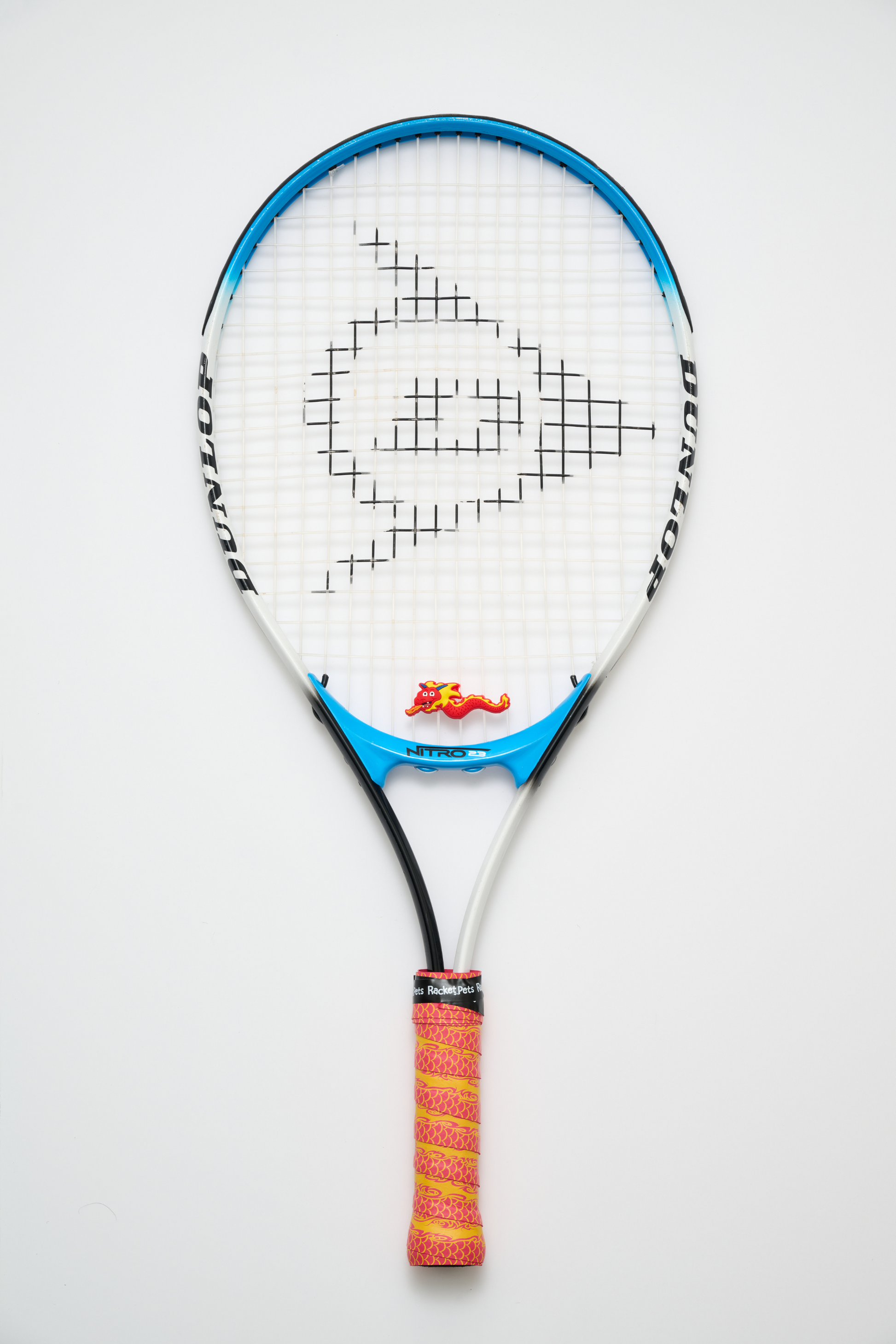 A unique tennis racket overgrip and dampener! In this red dragon themed set, the red grip tape is designed to look like the dragon's body. In addition, the set includes a matching dragon shaped dampener shock absorber in red and yellow.