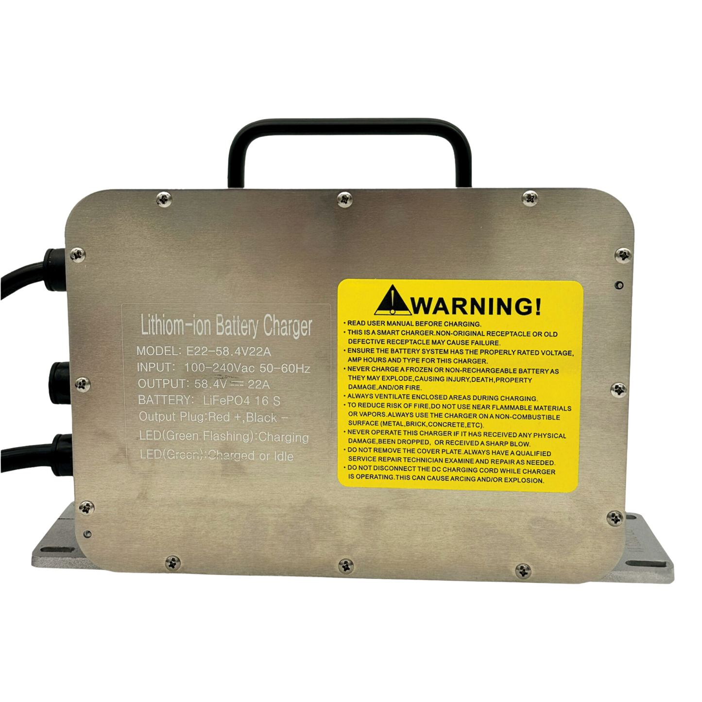 With a maximum output voltage of 58.4V and a sturdy output current of 22A at 120Vac input, it ensures efficient and rapid charging. The charger is equipped with an Output Anderson Quick Disconnect and a 5ft DC cable with ring terminals for secure battery connections.