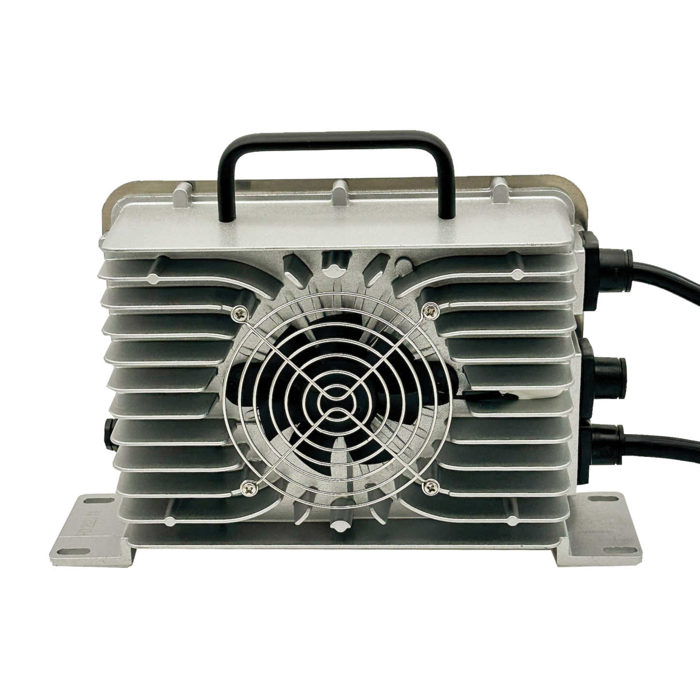 Introducing our 48V 22A LiFePO4 AC to DC Battery Charger, specifically designed for our 48V GC2 series battery. This charger comes with active fan cooling for temperature control and boasts an IP66 rating for dust and water resistance. It supports AC input voltages from 85Vac to 120Vac, featuring a convenient 3-prong AC plug.