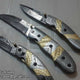 The TriGuard Collection is a set of three exquisitely crafted everyday carry folding pocket knives, perfect for those who appreciate both artistry and functionality. Each knife in this set features a 3-inch hand-engraved Damascus steel blade, renowned for its intricate patterns and razor-sharp edge. The handles are meticulously hand-engraved from steel and brass, giving these knives a timeless and elegant look. Equipped with a reliable liner lock mechanism, these knives ensure safety and ease of use. The set comes complete with premium leather sheaths for each knife, offering protection and style. With a Rockwell Hardness of 55-58 HRC, the TriGuard Collection is built for durability and precision, making it a perfect addition to any knife enthusiast’s collection. Available exclusively at KBS Knives Store.