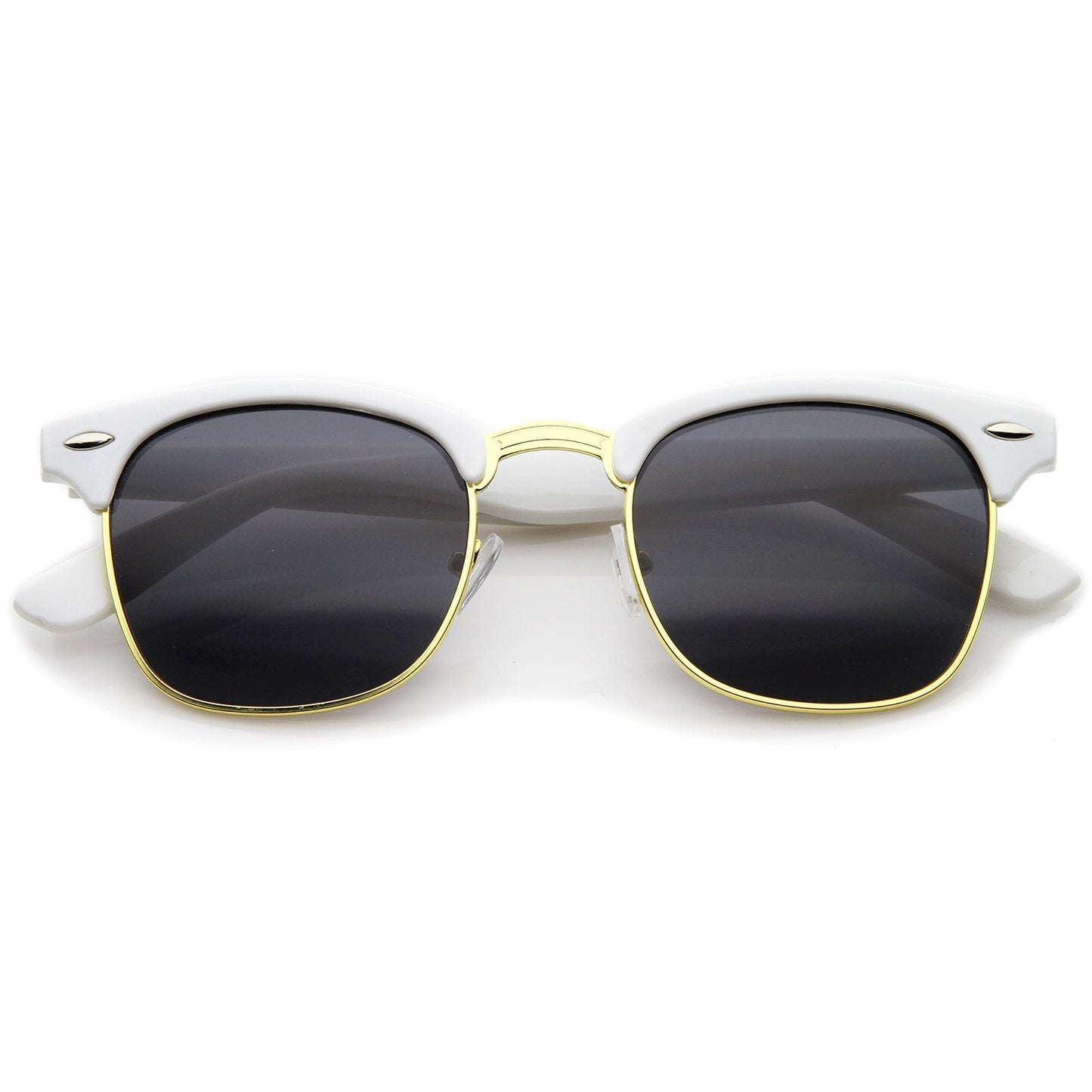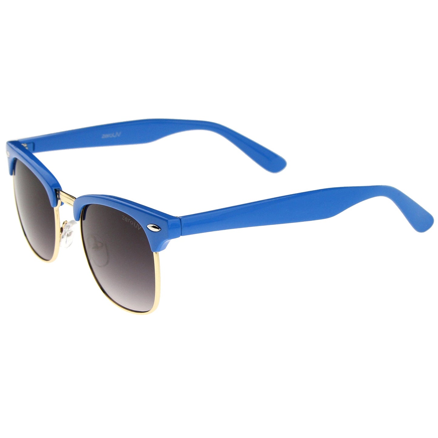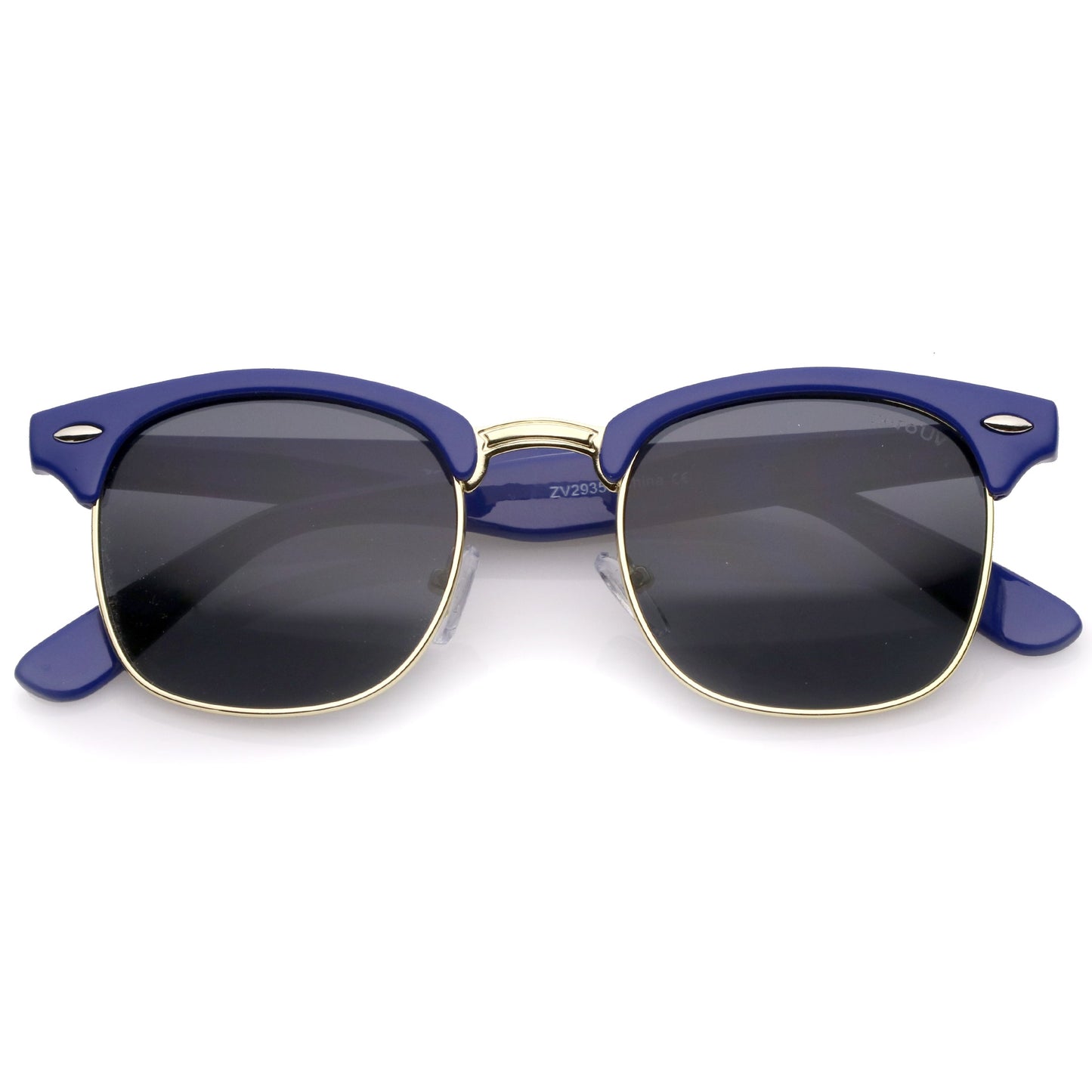 - Metal Trim and rivets add a sleek and luxurious feel to this classic style. Complete with stylishly wide temples that side high on the frame, these horn rimmed sunglasses come in a variety of bright colors to fit any style. Made with a plastic and metal based frame, English style nose pieces, metal hinges, and polycarbonate UV400 lenses.
