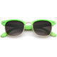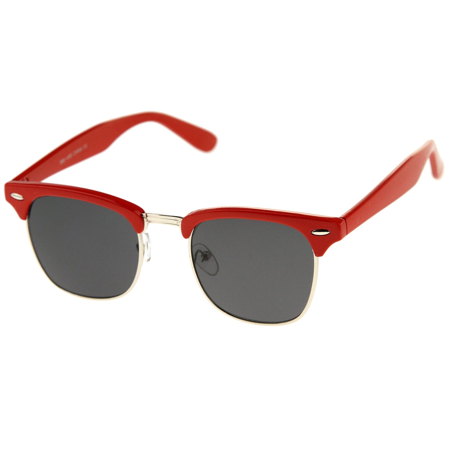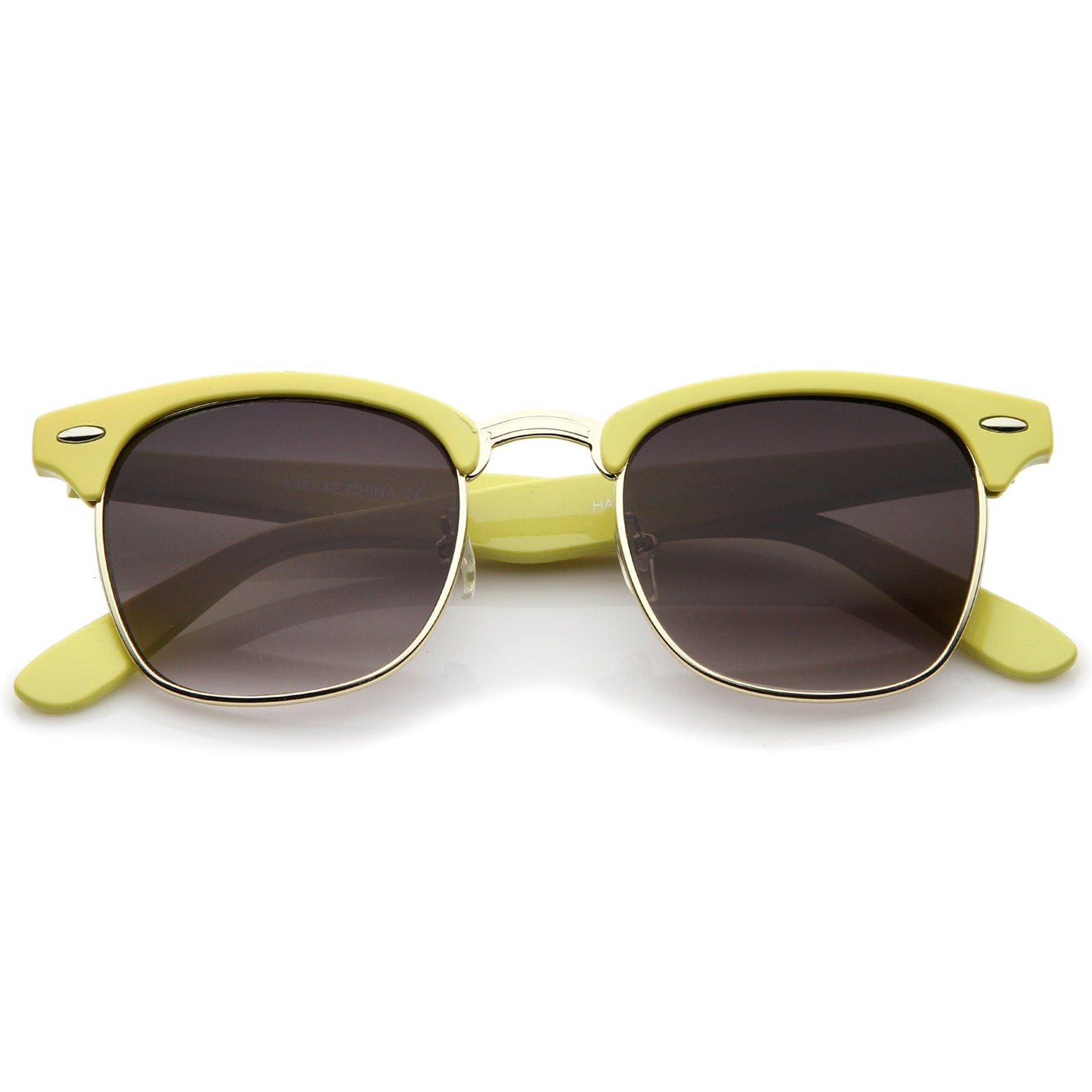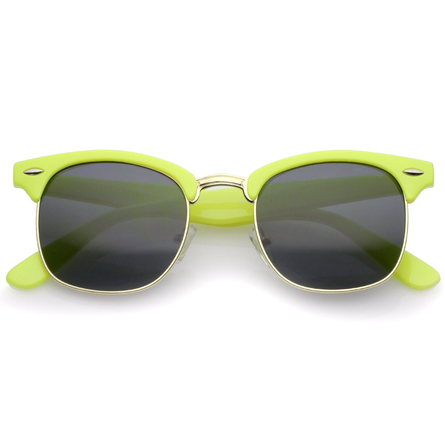 - Metal Trim and rivets add a sleek and luxurious feel to this classic style. Complete with stylishly wide temples that side high on the frame, these horn rimmed sunglasses come in a variety of bright colors to fit any style. Made with a plastic and metal based frame, English style nose pieces, metal hinges, and polycarbonate UV400 lenses.
