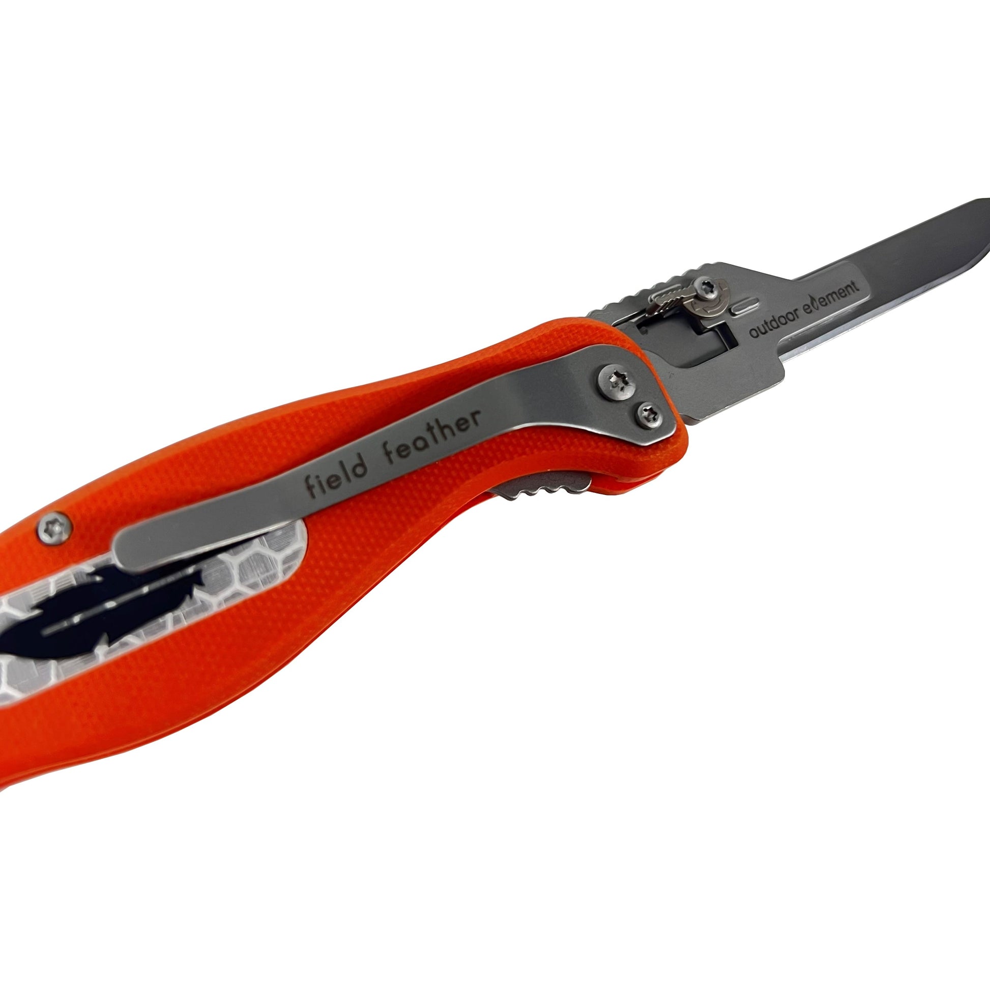The Field Feather is the ultimate, folding caping blade for hunting and field dressing. The razor-sharp, surgical blades are safely replaceable -- thanks to our patent-pending dual locking feature.