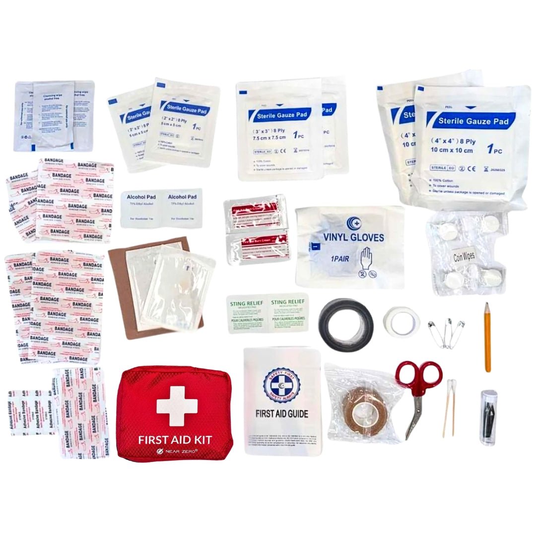 Near Zero 55-item First Aid Kit is perfect for the car, travel, camping, backpacking or hiking. Waterproof and ultralight. We have custom built the ideal kit, which includes essential items that are not easily found with other comparable first aid kits, such as duck tape, medical tape wrap, coin wipe cleaning towels, scissors, pencil, and much more! Well stocked with enough items to treat up to 3 people on a day hike. Weighs 6 ounces. Contains 55 pieces.