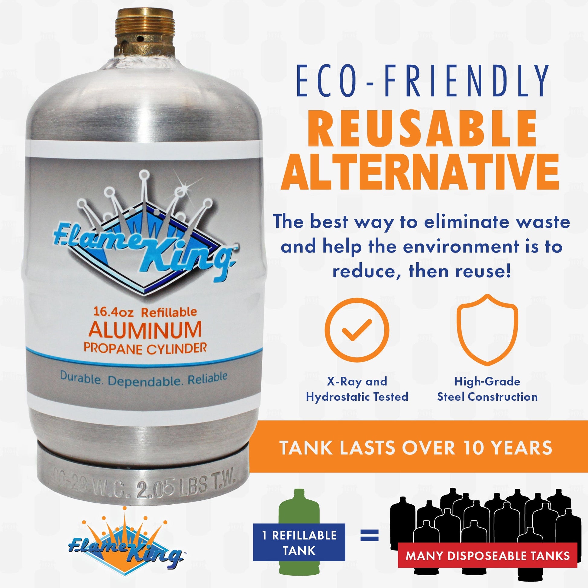 This tank is built from high-grade aluminum and has a bright, shiny, smooth finish with clean, dry, and flake-resistant interiors. It fits all appliances that today's non-refillable tanks work with.