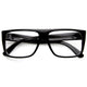Contemporary frame that presents a stylish flat top with clear lenses that is great for a clean casual look. Made with an acetate based frame, metal hinges and clear UV protected polycarbonate lenses.