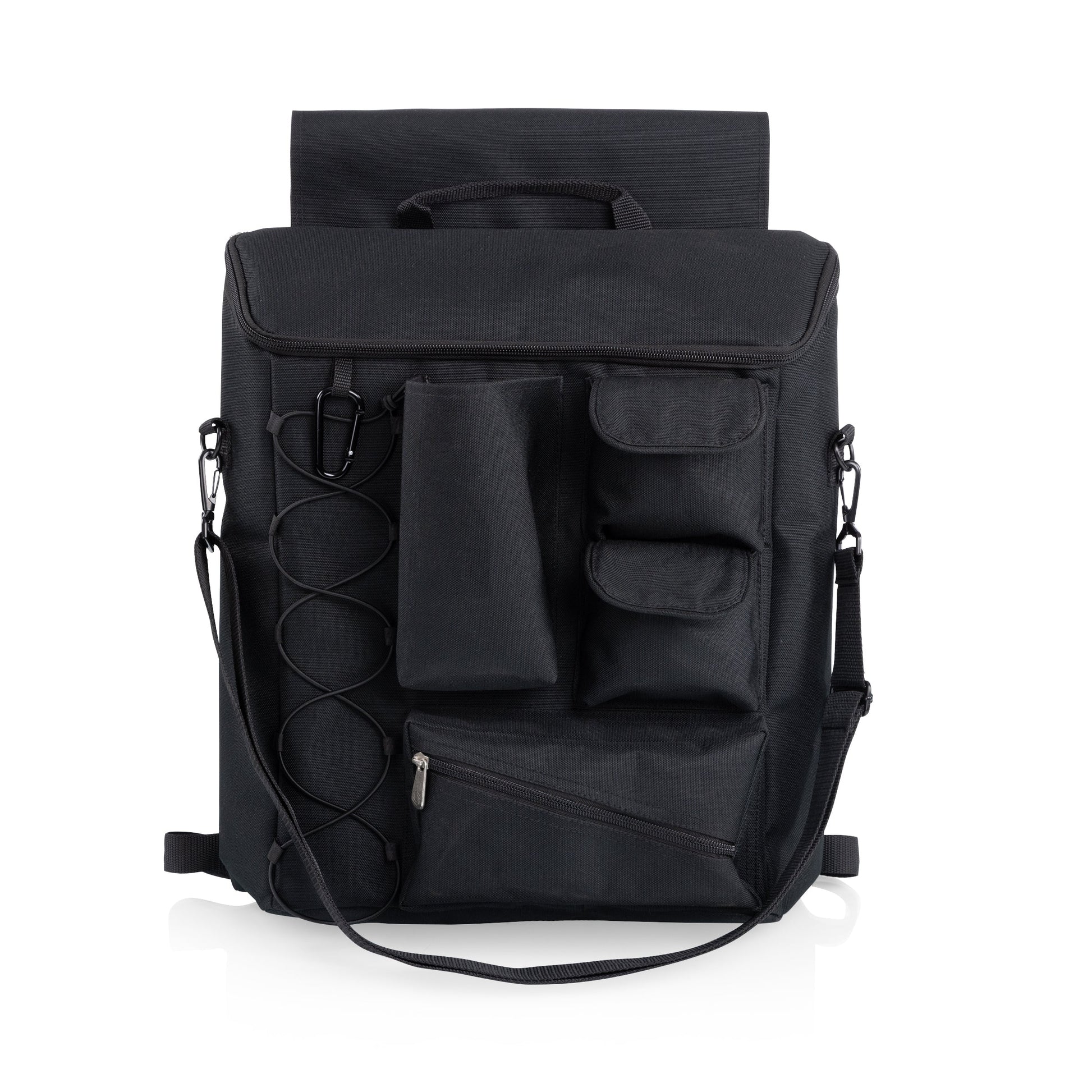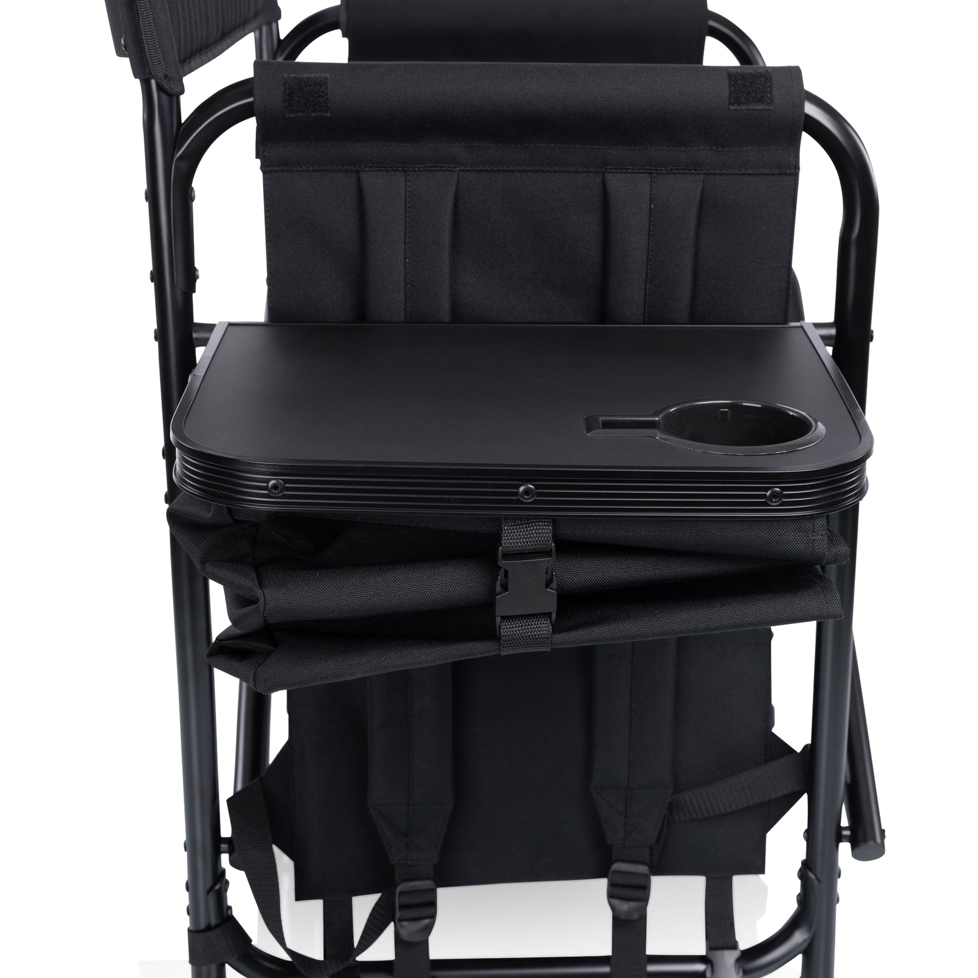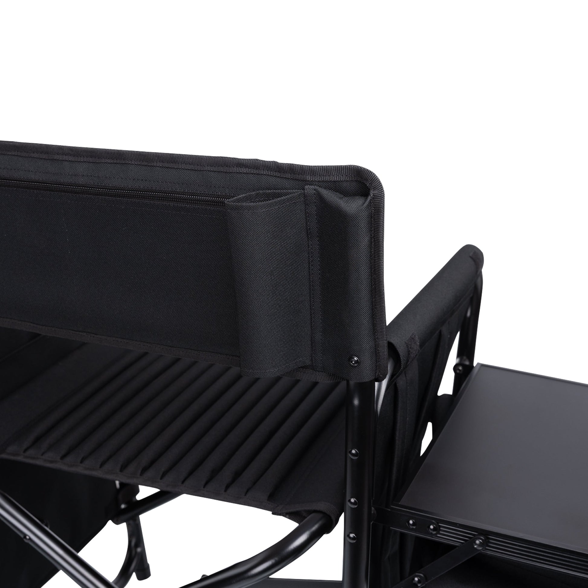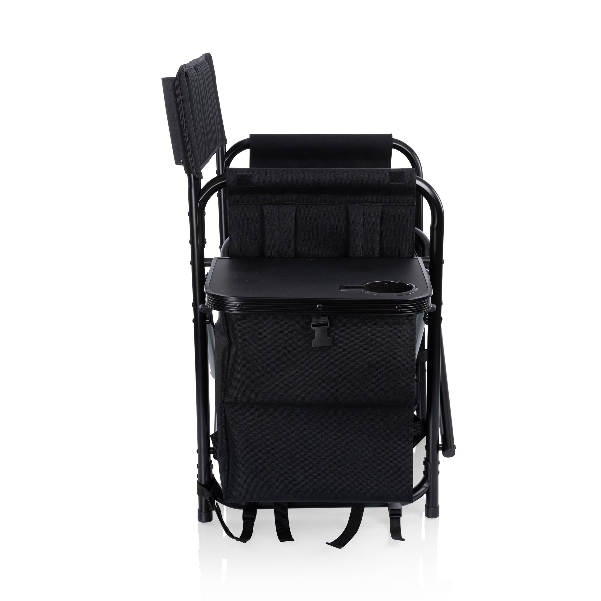 The Fusion Camping Chair is a heavy duty portable camp chair with so many features, you might make it your new office! A durable, powder-coated aluminum frame and ribbed padding in the seat and back rests is only the beginning - this outdoor chair with table on the right side also includes a two-tiered, accordion-style shelves hanging below, plus a side-mounted, fully-detachable 24+1-can-capacity cooler with its own backpack straps, a cell-phone-specific pocket, specialized fabric loops for an umbrella or sports banner, and numerous pockets. The Fusion is more than an outdoor portable chair, it's a camp chair, a beach chair, and heck - a lawn chair relaxation throne. All that and it’s still lightweight enough to be easily portable yet strong enough to hold up to 350 lbs?! This is an outdoor directors chair that never disappoints.