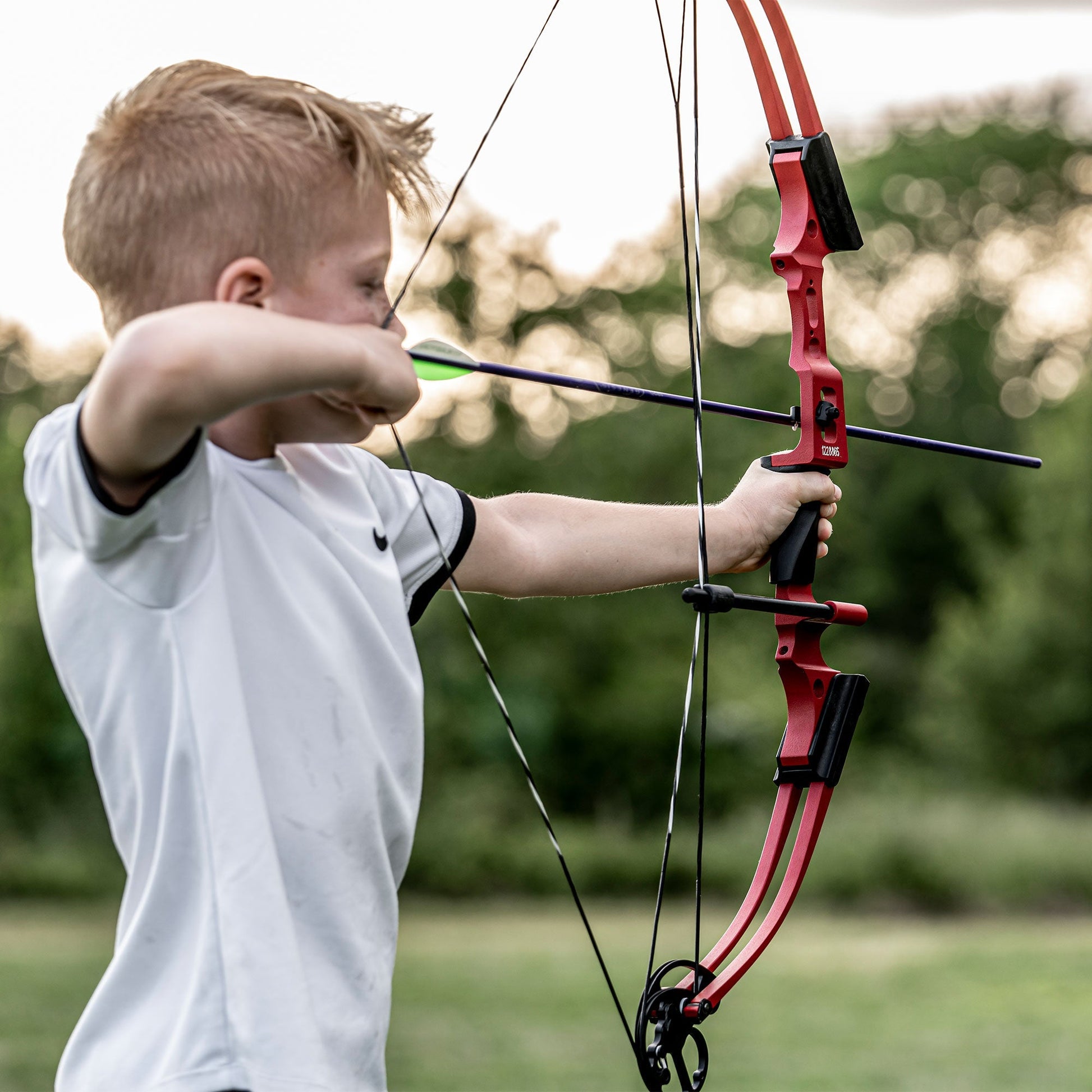 - Youth archery bow and arrow set designed for right-handed users; Bow features an adjustable draw length range of 14-25 inches and an adjustable draw weight of 6 to 12 pounds