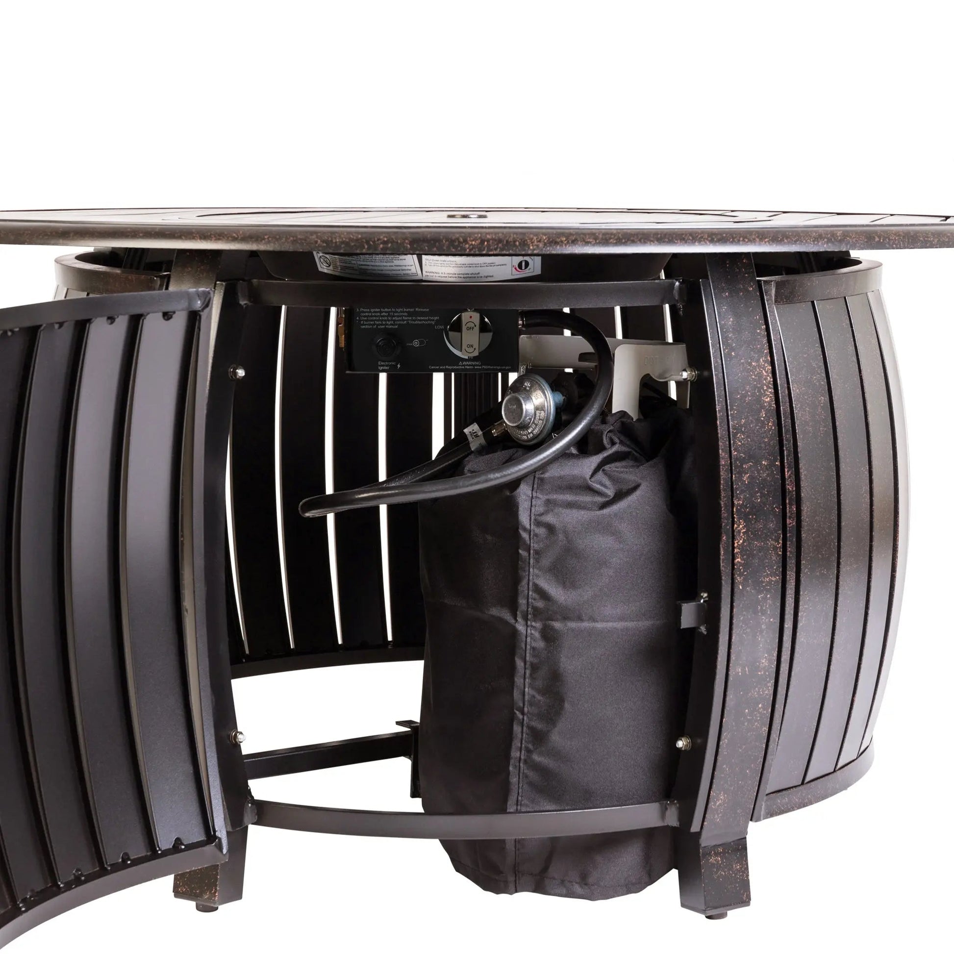 The multi-functional Grand Cooper 44" Round Aluminum Convertible Gas Fire Pit Table operates on a standard 20 lb propane tank which sits concealed beneath the unit, accessible through a hinged door. This unit functions both as a fire pit and as an outdoor patio table when using the convenient aluminum fire bowl lid. The 55,000 BTU burner produces a beautiful, fully adjustable flame and can run on LPG or NG gas. Plus, it comes complete with clear droplet fire glass and a dust cover to protect the appearance.