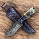 Experience unmatched craftsmanship with this custom handmade hunting knife, featuring a 3.5-inch Damascus steel blade for precision cutting. The handle, crafted from buffalo and sheep horn, offers a secure grip and a unique, rustic appeal. This 7.5-inch knife comes with a premium leather sheath for safe carrying. Perfect for hunting, outdoor adventures, and collectors.