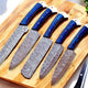 Upgrade your culinary experience with our custom handmade Damascus kitchen knives set. Crafted from premium Damascus steel, these knives offer razor-sharp precision, durability, and a unique wavy pattern that stands out in any kitchen. The exotic wood handles provide a comfortable grip, ensuring control and elegance with every cut. This set ranges from 13 inches to 8 inches in overall length, perfect for all your kitchen needs. Comes with a premium leather roll for safe storage and portability.