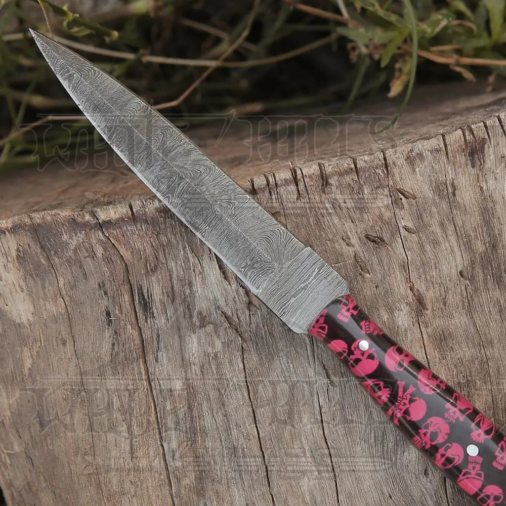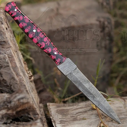 This artisan-crafted dagger boasts a sleek skull design and exceptional performance. Its top-quality Damascus steel blade and intricate full tang construction make it a stunning work of art. Carry it securely with the full-grain leather sheath, whether on your hip or in your boot. Or, for a unique touch, use it as a one-of-a-kind letter opener.