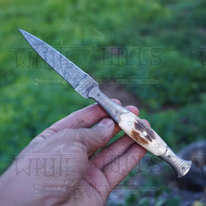 - Handle Material: Damascus steel front and rear bolster with stag antler
