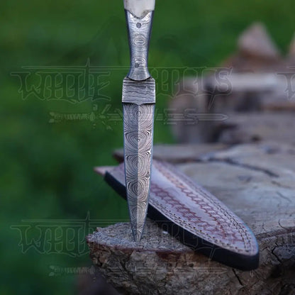 This intricately crafted Damascus steel dagger is not imbued with magical powers, but its balanced design and smooth stag antler handle make it a joy to wield. The bolsters, ornate design, and full tang add to its artistic appeal. Keep it secure and hidden with the included full-grain leather sheath, whether on your hip or in your boot. Or, use it as a stylish and functional letter opener.