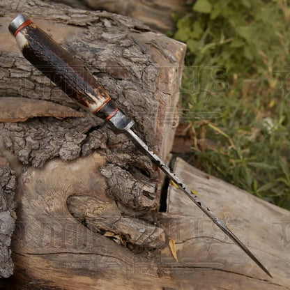 This superb design knife is hand forged.Blade of this knife has a nice file work and is made of 512 layers of stainless steel and high carbon steel with hardness 55-60 HRC . This robust knife is lab tested under intense conditions, the balance and shape of this knife ensures perfect grip.