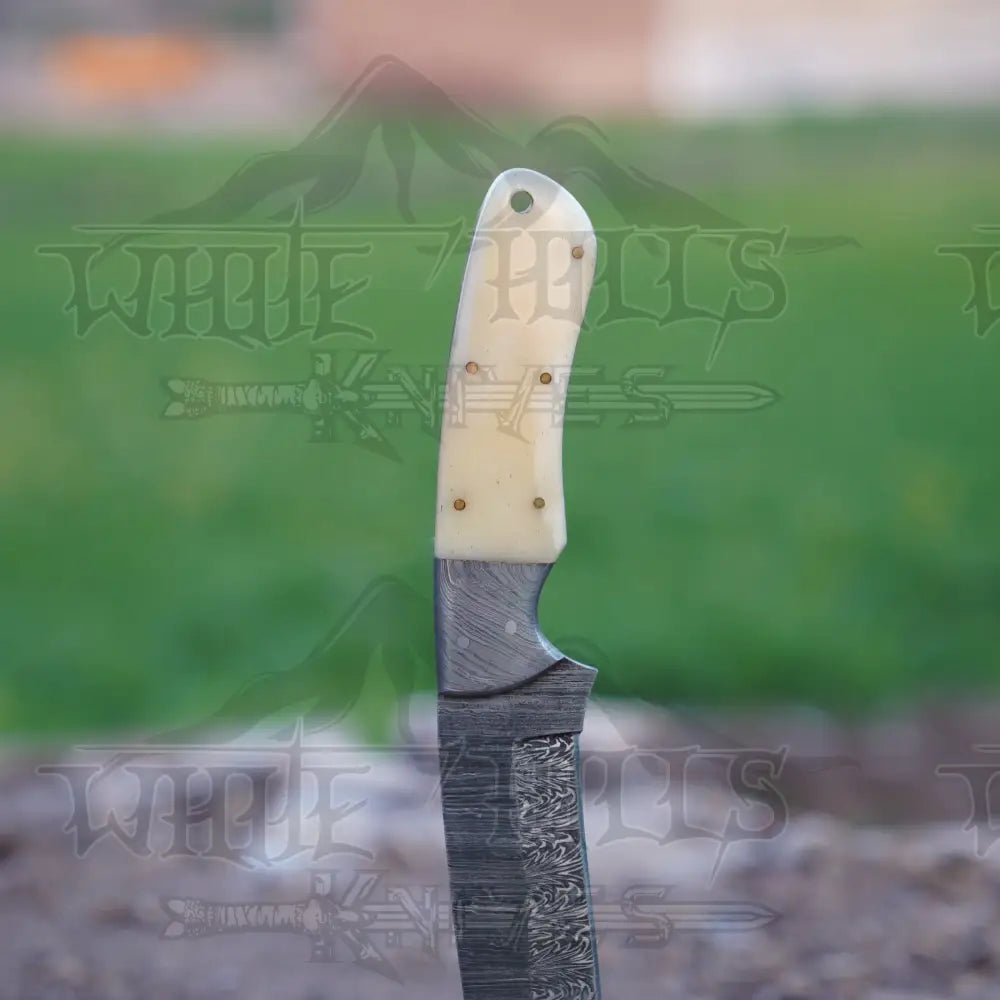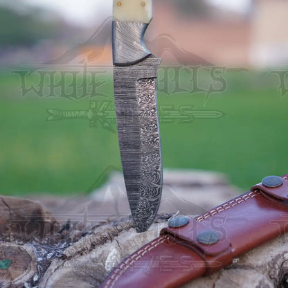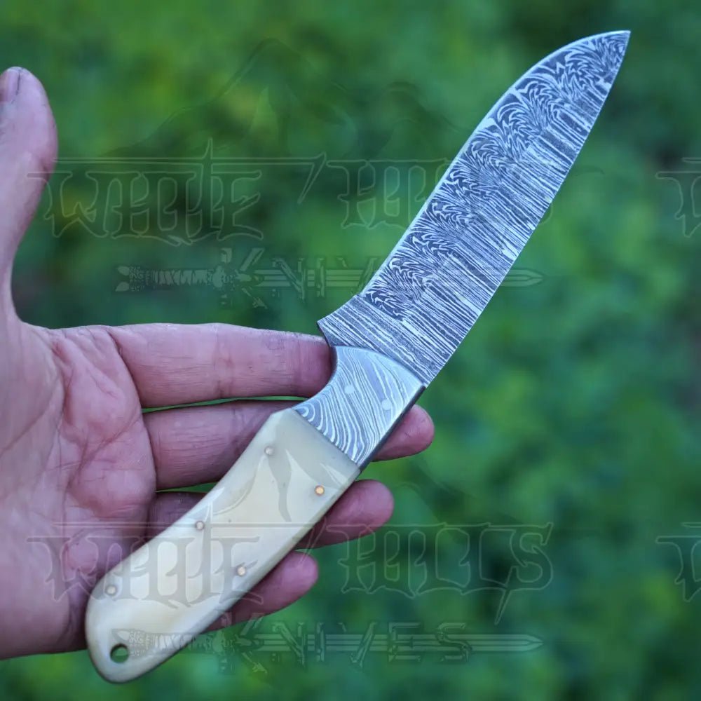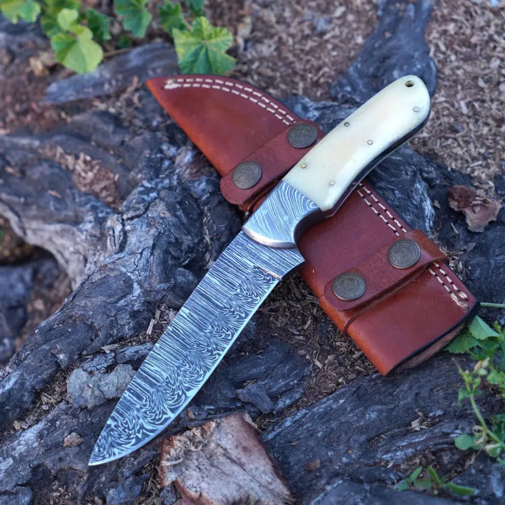 This handmade fix blade full tang damascus knife having Damascus bolster and camel bone handle. You don’t have to be a general to enjoy this full-tang work of art. A large handle fits nicely into your hand and gives you confidence when wielding this beautiful knife.