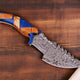 This custom handmade hunting knife is crafted with a 5.5-inch Damascus steel blade, designed for durability and precision. The 10-inch overall length provides a balanced feel for field dressing, skinning, or outdoor use. A contoured wooden handle ensures a firm grip, while the genuine leather sheath adds both style and protection. Built for performance and rugged elegance, this knife is a reliable companion for every hunter.