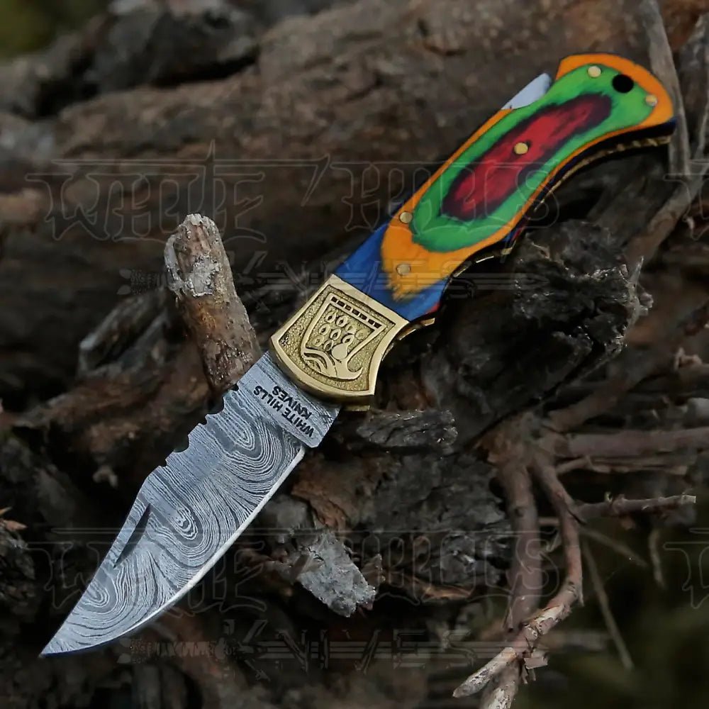 White Hills Knives HANDMADE DAMASCUS STEEL POCKET KNIFE - Folding Knife- Stain Wood Handle With Engraved Brass Eagle Bolster WH 5045