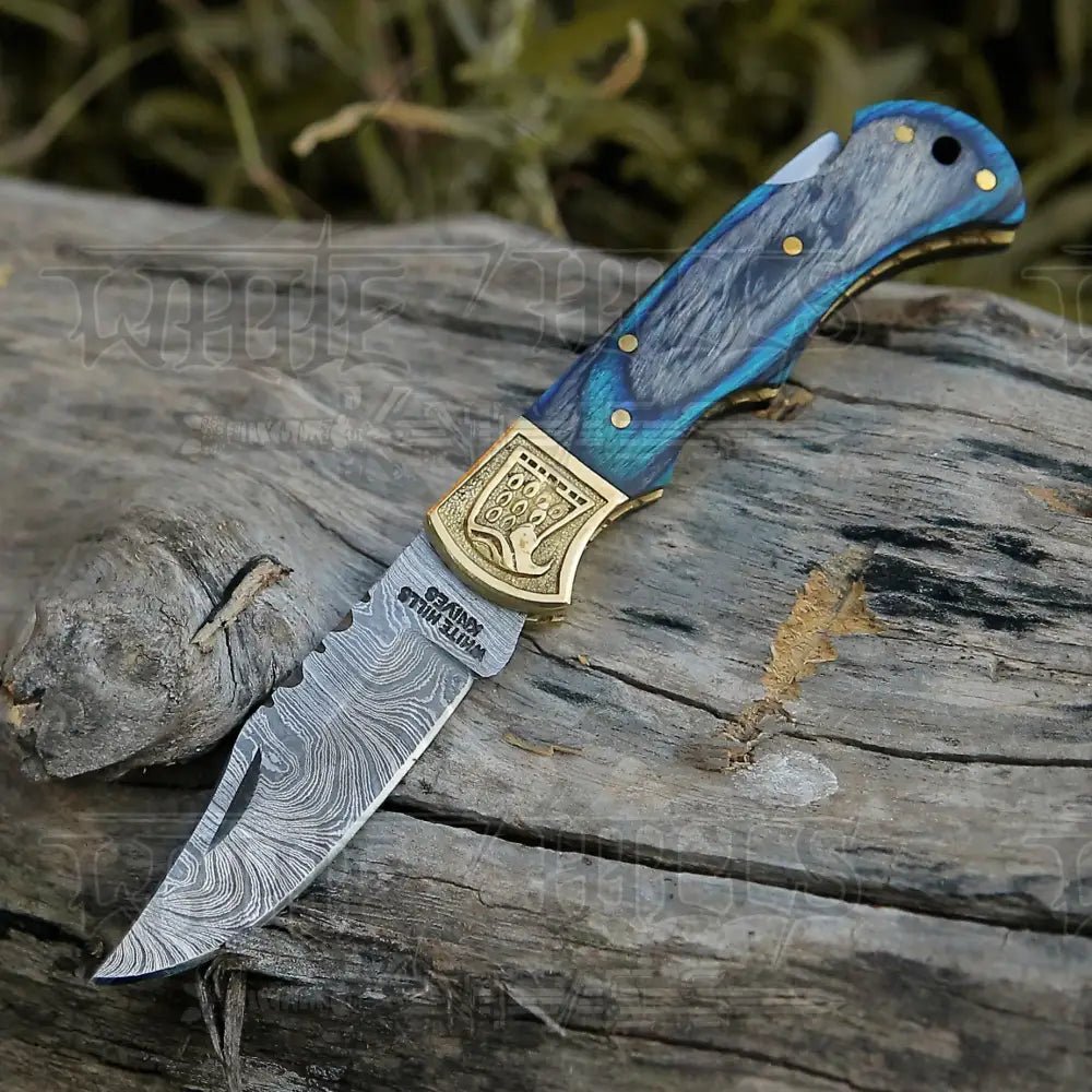 White Hills Knives HANDMADE DAMASCUS STEEL POCKET KNIFE - Folding Knife- Stain Wood Handle With Engraved Brass Eagle Bolster WH 5050
