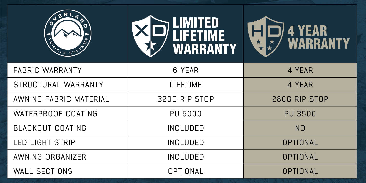 The Overland Vehicle Systems Nomadic 270LT Awning comes with a 4-year limited warranty, covering defects in materials and workmanship under normal use.