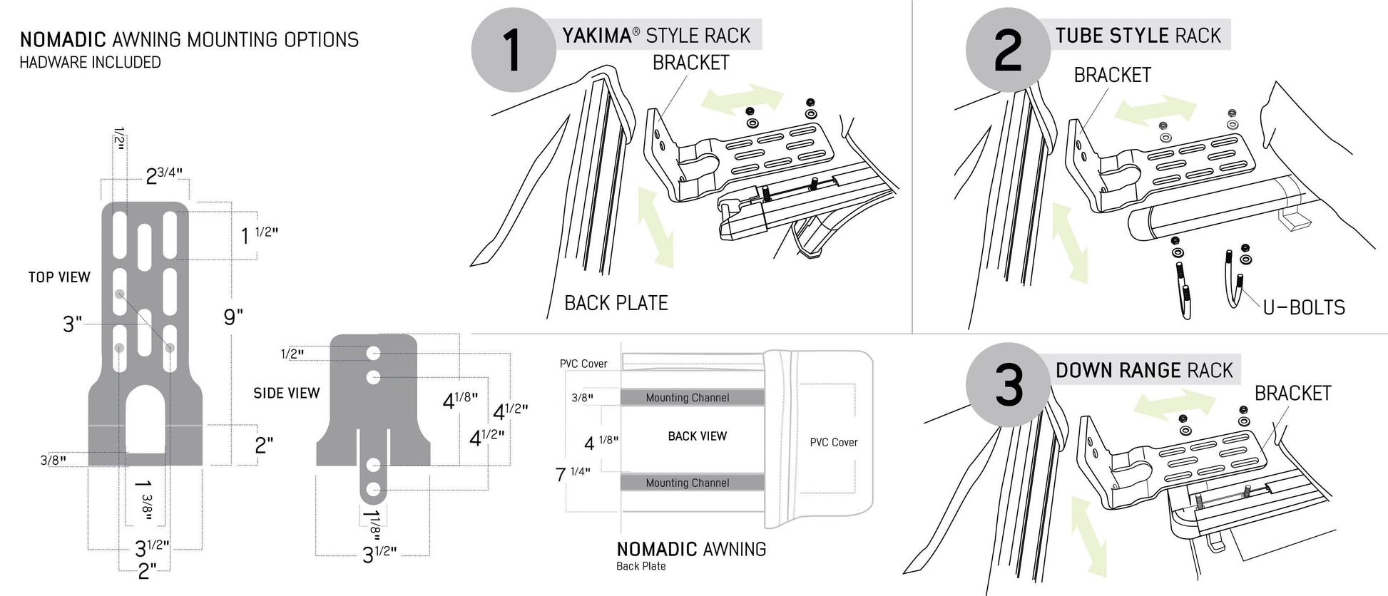 The Nomadic 270LT Awning is designed to fit most factory and aftermarket roof racks. Before installation, confirm the weight capacity of your roof rack. The package includes all the necessary mounting hardware for an easy, hassle-free installation.