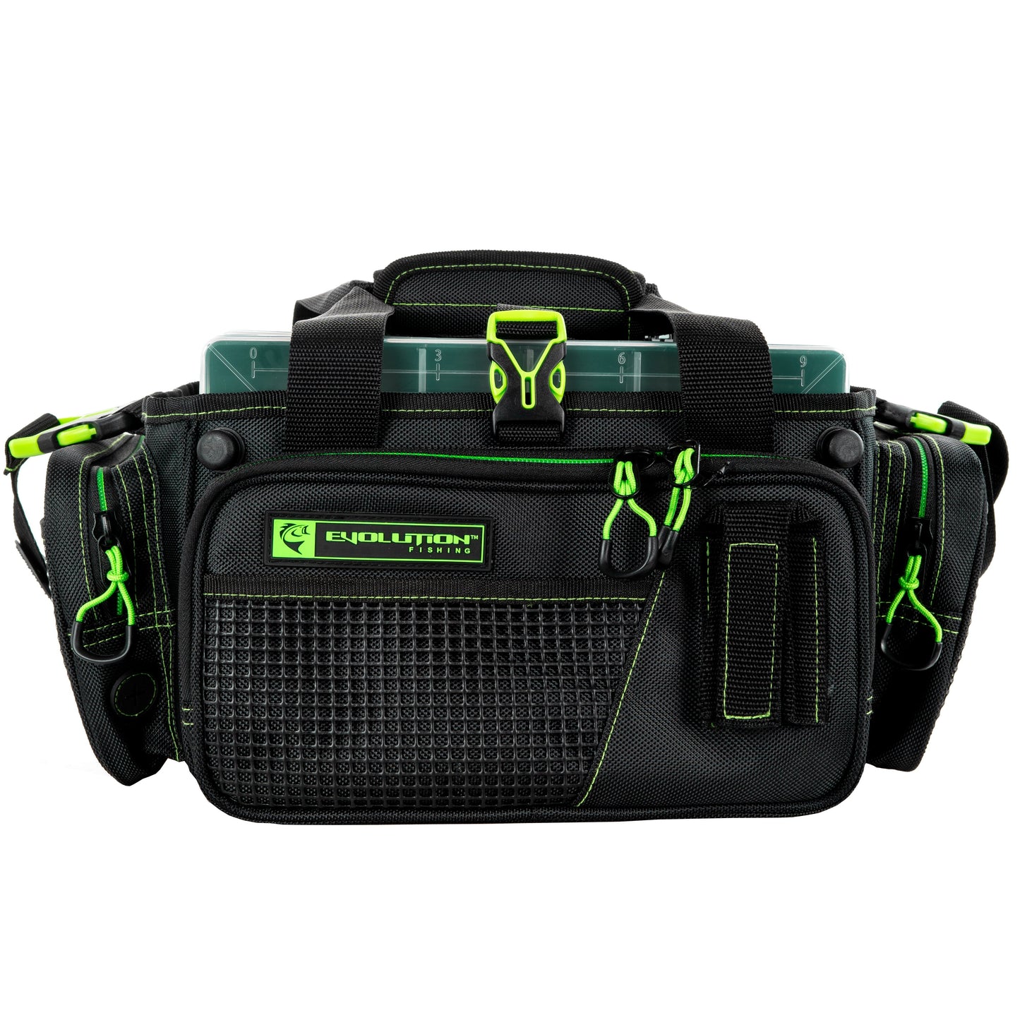 With its open top feature and extremely rugged wear-resistant 1680D construction, the Drift Series Topless Horizontal Tackle Bags deliver the quality and functionality that Evolution Fishing is known for. These Drift Series Tackle Bags have an innovative large mouth, open top feature that provides quick and easy access to all your trays. Slide your trays in horizontally with this version of the tackle bag. The integrated tie down Y-Strap will secure your trays in the bag, and in case of stormy weather, these bags are equipped with an integrated rain fly that you can zip up and store away when not in use. With 3 large exterior storage pockets and 4 rubber mesh slip pockets, you’ll have plenty of room to store all your accessories. It’s also equipped with a plier holster, side pocket line spool feed, and a non-slip, waterproof bottom with integrated drainage grommets. Transporting these tackle bags will be a breeze with the adjustable, removable shoulder strap and the padded top carry handle. With the capacity to hold up to 5 tackle trays, it’s more than capable of holding all your fishing essentials. Each tackle bag will include 5 matching color Drift Series Tackle Trays.