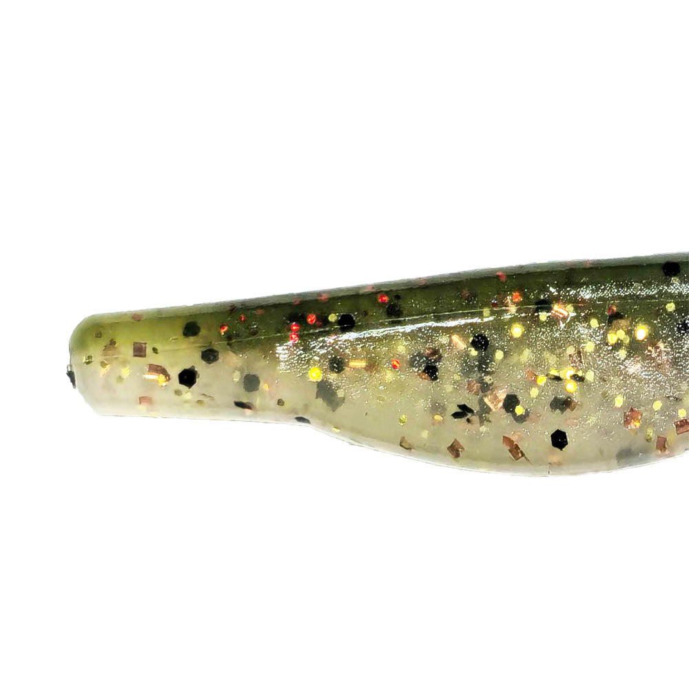 The perfect design for the “Hover” - “Moping” – or “Strolling” technique. It’s deadly on our Damiki and Ball Head Jigs….or nose hook it and put a nail weight in the solid belly. The wide body design lets it “glide” and allows to be cut down to match the hatch!