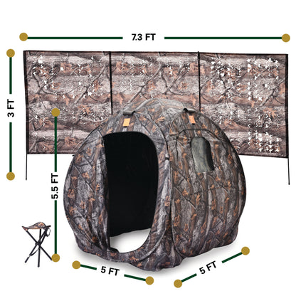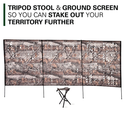 - ALL SIDES COVERED: All four sides open so you’ll always have a shot at your prey. Openings are large enough for both bow and rifle. Tripod seat included so you can be comfortable while waiting for your prey.