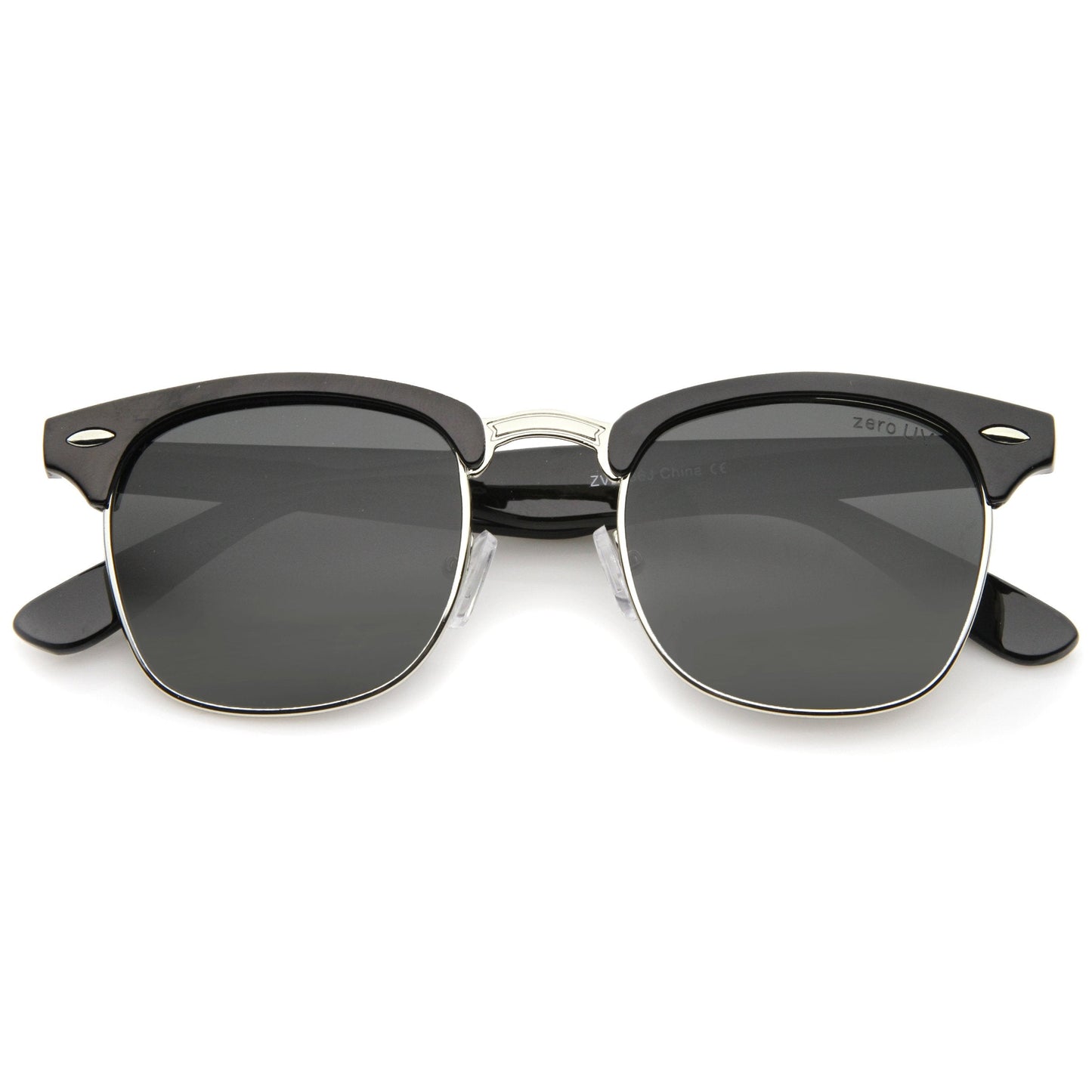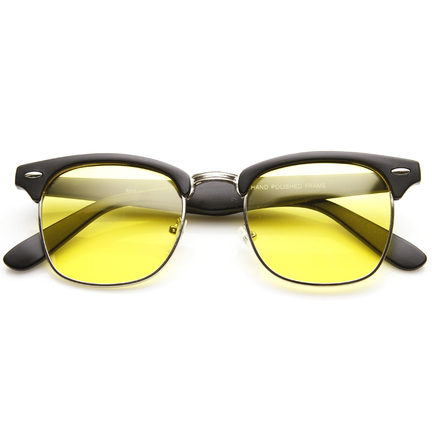 - Vintage inspired polarized yellow lens horned rim half frame hat stays true to the classic and iconic look. Frame is made with black acetate brow and arms, metal wire lens lining and metal nose bridge. Features metal hinges, English style nose pieces, and dark-tinted poly-carbonate Polarized Yellow UV protected lenses.