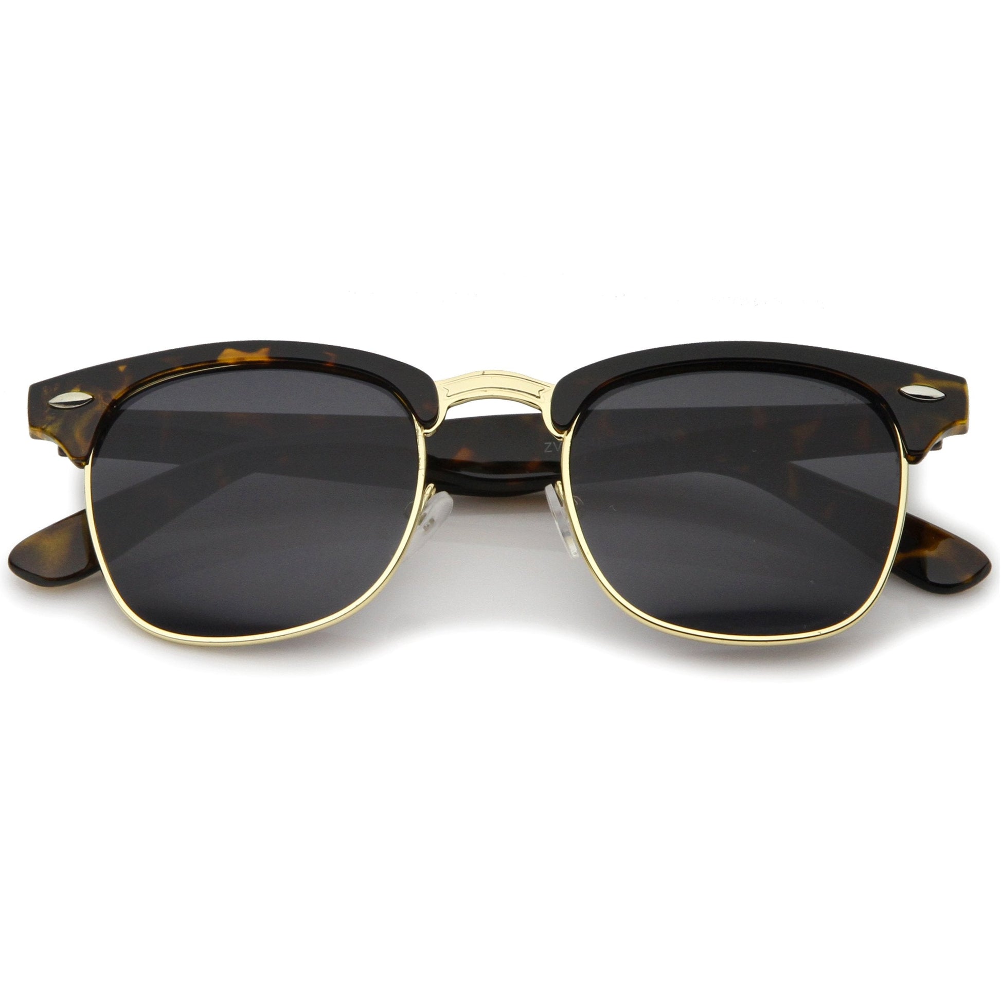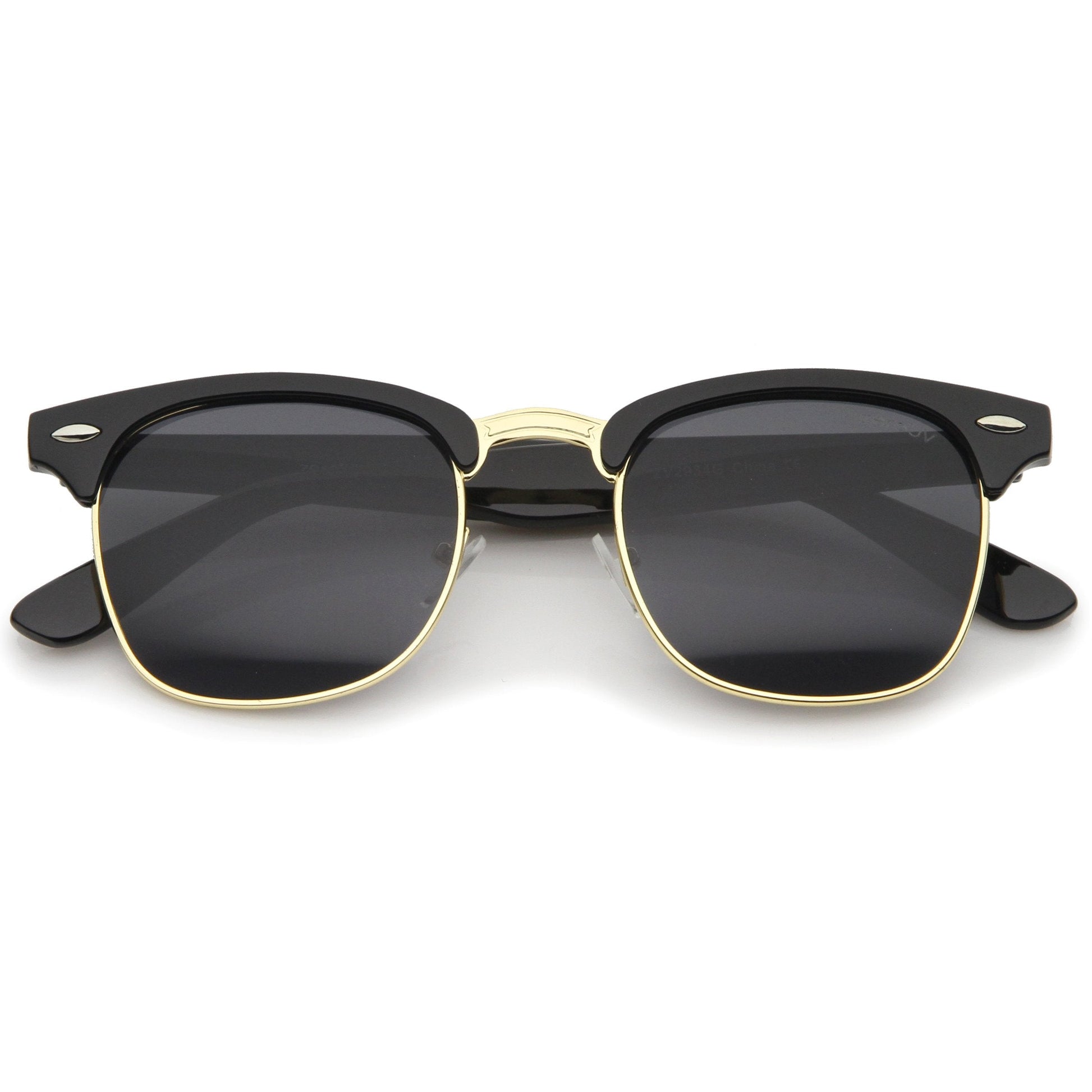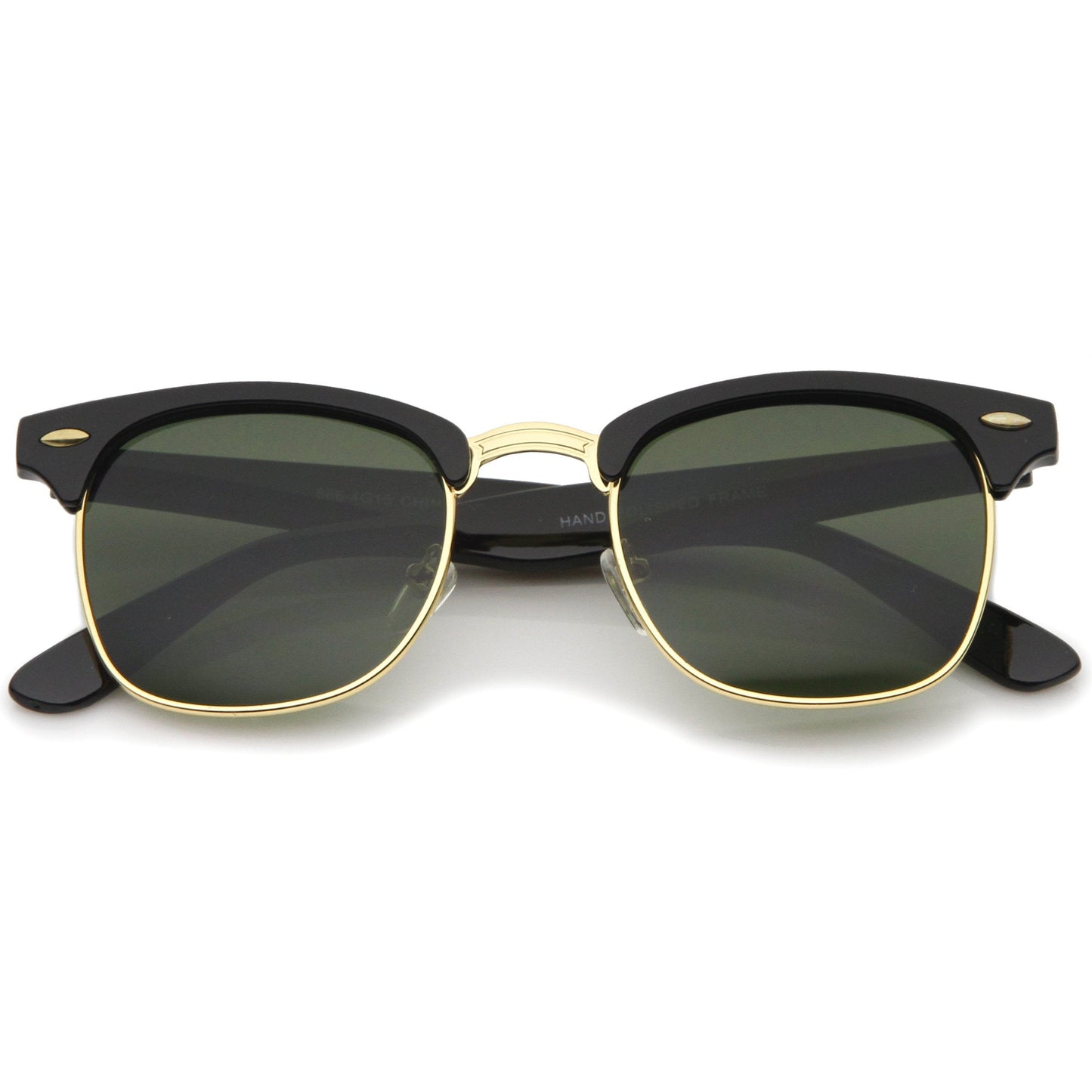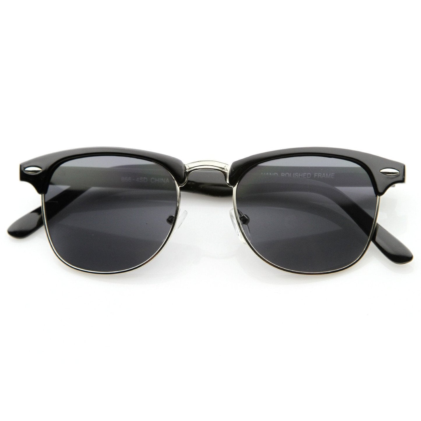 - Vintage inspired horned rim half frame shape that stays true to the classic and iconic look. Frame is made with black acetate brow and arms, metal wire lens lining and metal nose bridge. Features metal hinges, English style nose pieces, and dark-tinted poly-carbonate UV protected lenses.