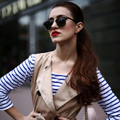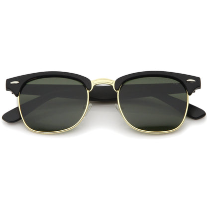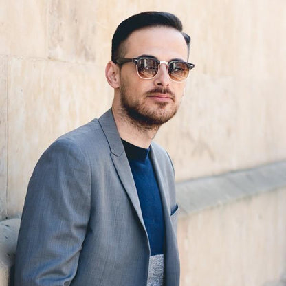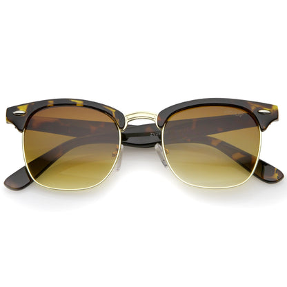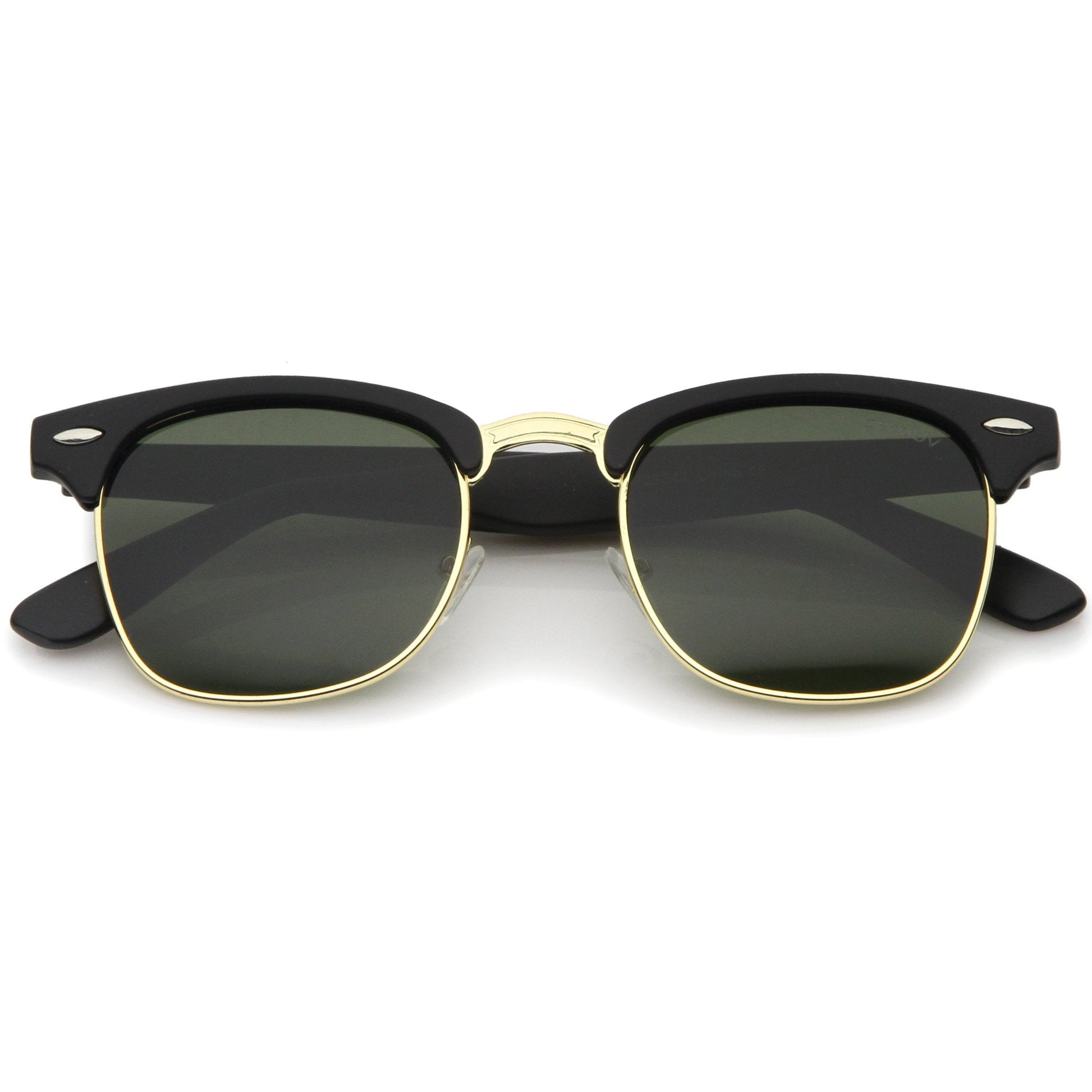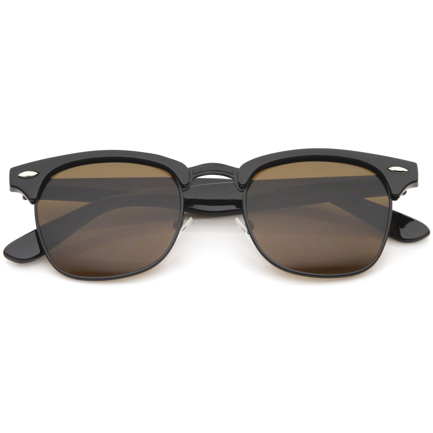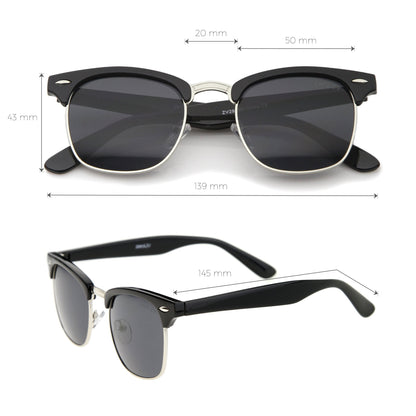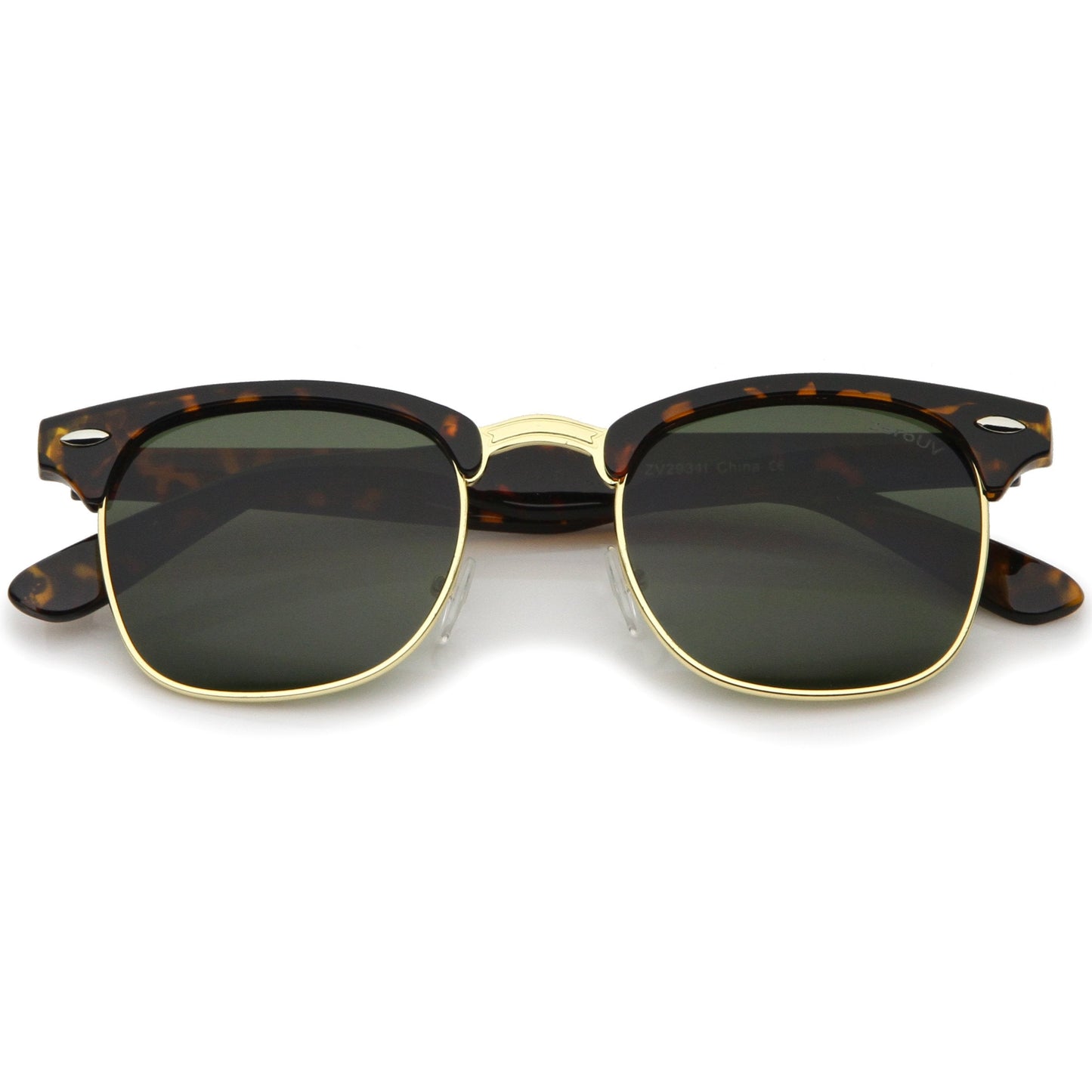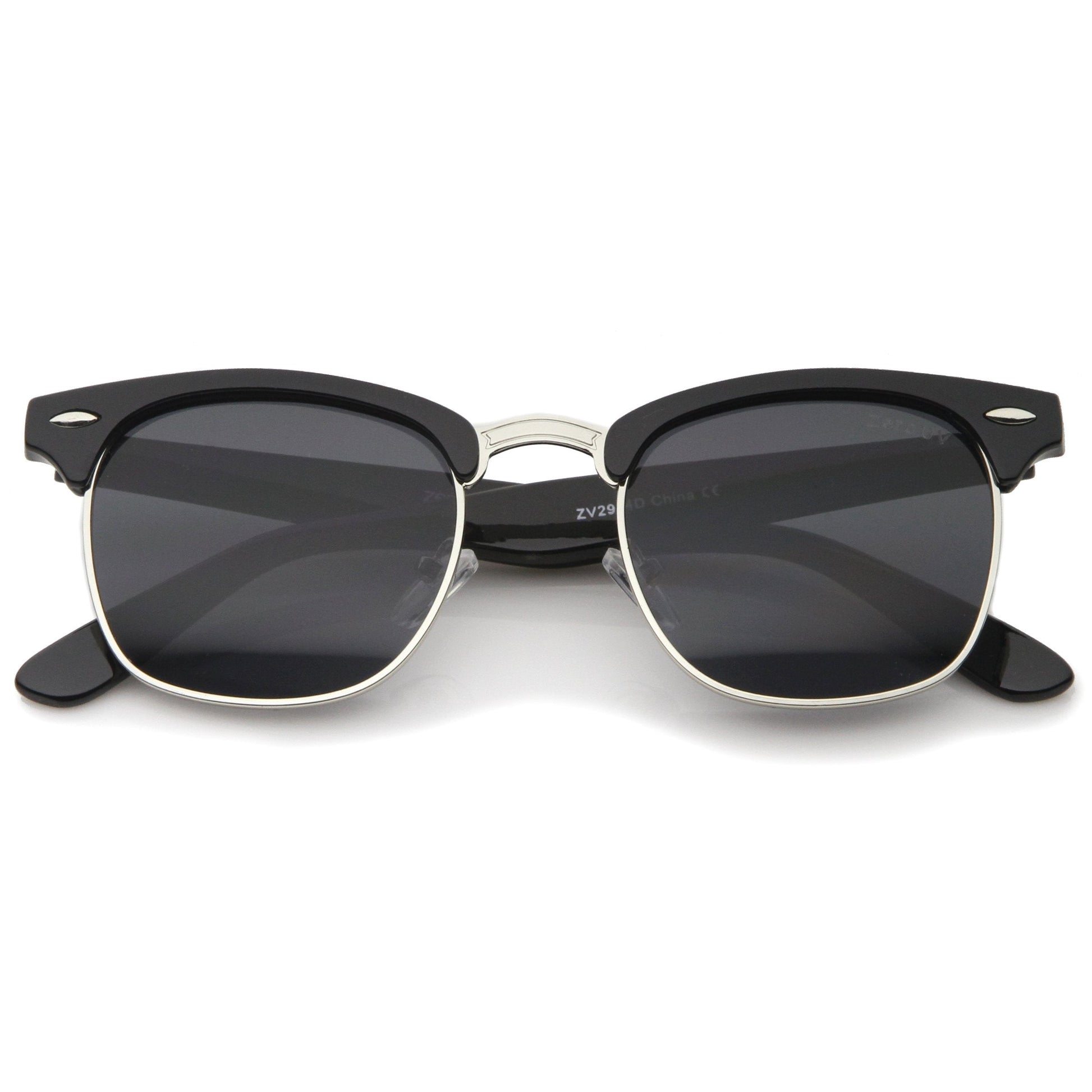 - Vintage inspired horned rim half frame shape that stays true to the classic and iconic look. Frame is made with black acetate brow and arms, metal wire lens lining and metal nose bridge. Features metal hinges, English style nose pieces, and dark-tinted poly-carbonate UV protected lenses.