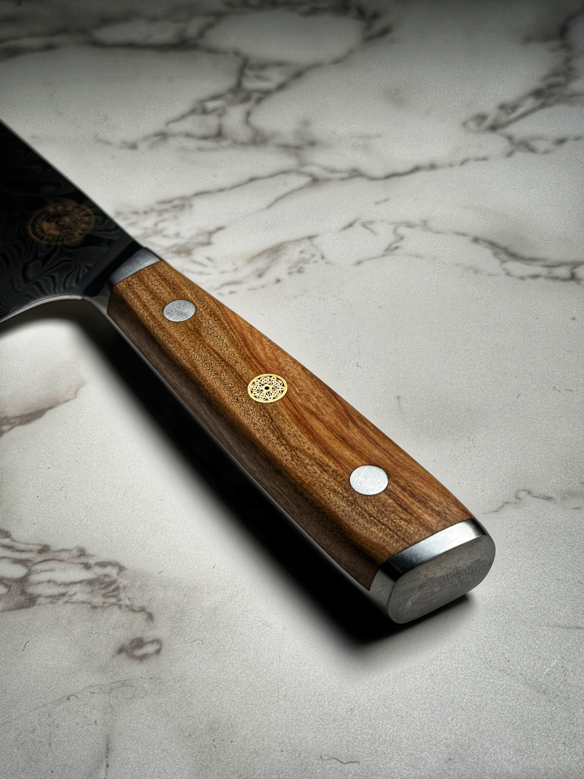 Elegant and Ergonomic: The handle, sculpted from the finest olive wood, adds a touch of natural elegance to the Interstellar Petty Chef Knife. With a harmonious blend of form and function, the handle not only showcases the beauty of olive wood but also provides a comfortable and secure grip, ensuring precision and control with every cut.