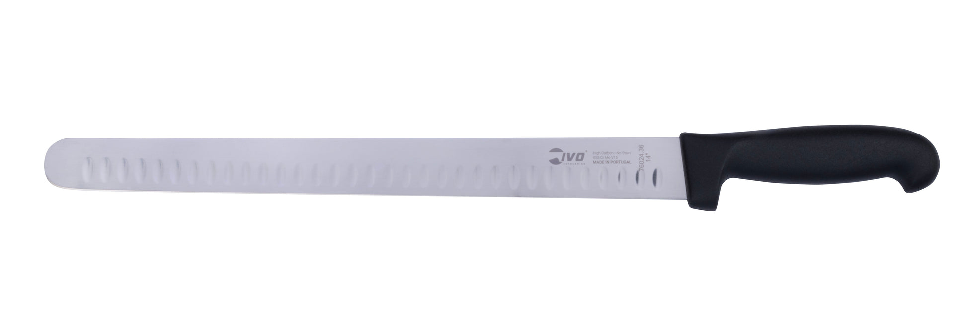 Calling all outdoor enthusiasts and wilderness chefs! The IVO® ProEdge 14" Black Salmon Knife with Grantons is your must-have tool for slicing and preparing large cuts of meat in the great outdoors. Crafted with a comfortable handle designed for extended use, this knife features X50CrMoV15 steel—the powerhouse of this set. Slice through meat quickly, efficiently, and accurately with the IVO® ProEdge 14" Black Salmon Knife. Whether you're filleting salmon by the river, or prepping meals at your campsite, this knife is your trusted companion for outdoor cooking adventures. Gear up and elevate your outdoor culinary experience with the IVO® ProEdge Salmon Knife!