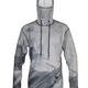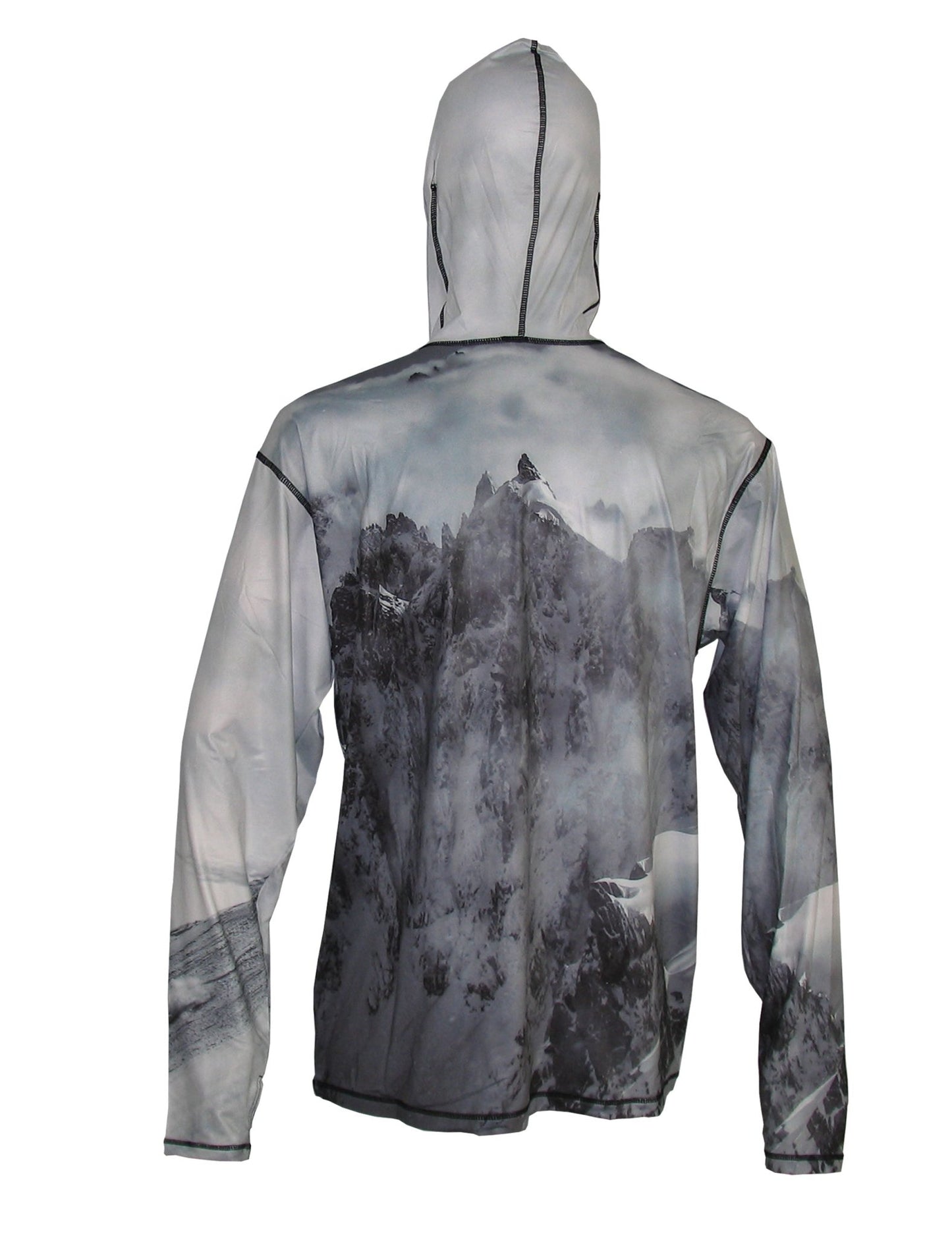 In this Mountaincognito lightweight SunPro Hoodie our Jagged Edge presents two skiers in an incredible mountain range that wraps around the back of the garment. The sun protective UPF50 Sunpro Hoodie features a lightweight (150gr.) 4-way stretch fabric (85% polyester 15% Spandex) for comfort and fit unmatched. An internal neck gaiter built into the hood is included for free. Great sun protection, moisture wicking apparel.