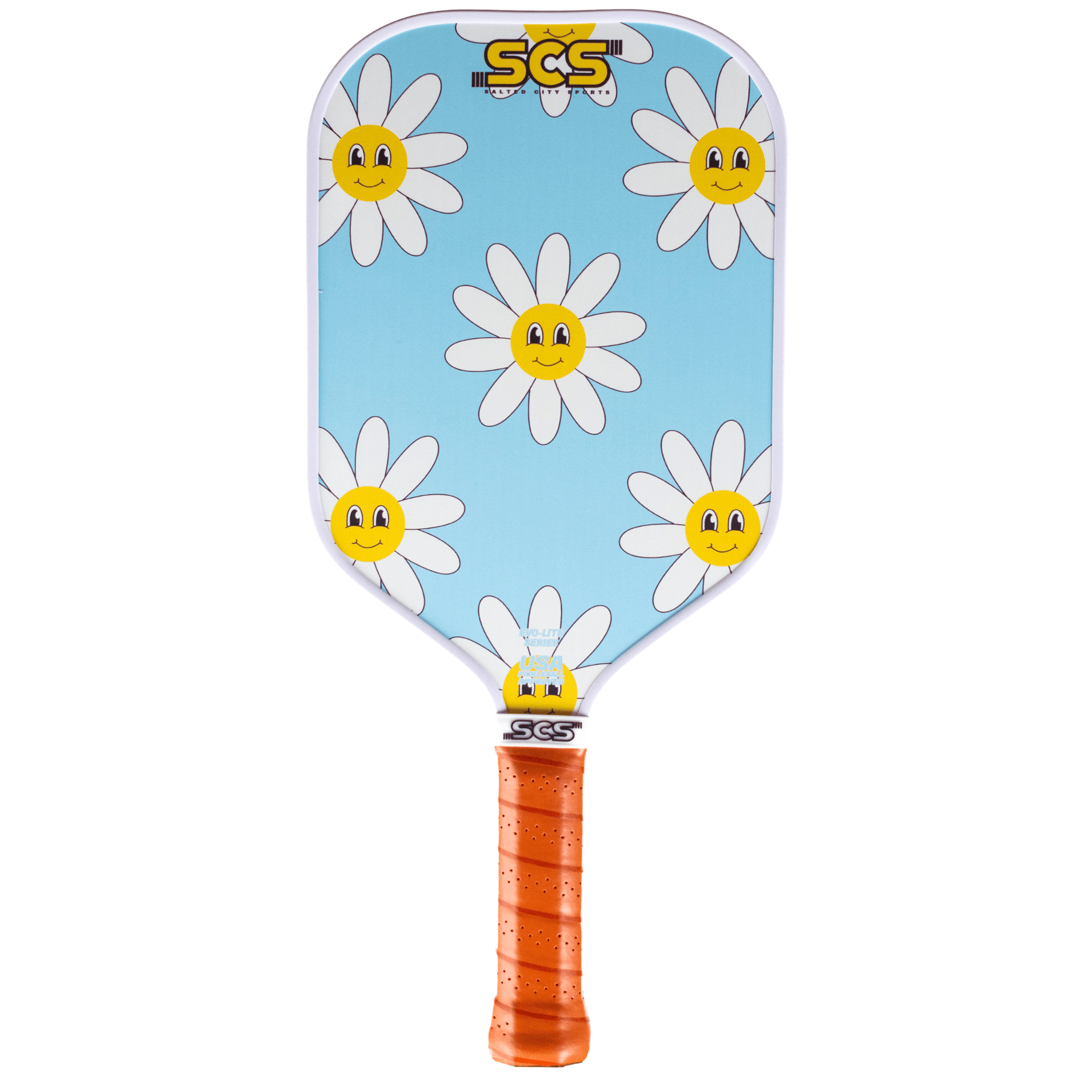 Introducing the Joyful Petal Evo-Lite Series pickleball paddle - a happy design featuring a daisy flower with a smiley face. Stand out on the court with this quirky and fun paddle that fits any style. Serve with a smile!