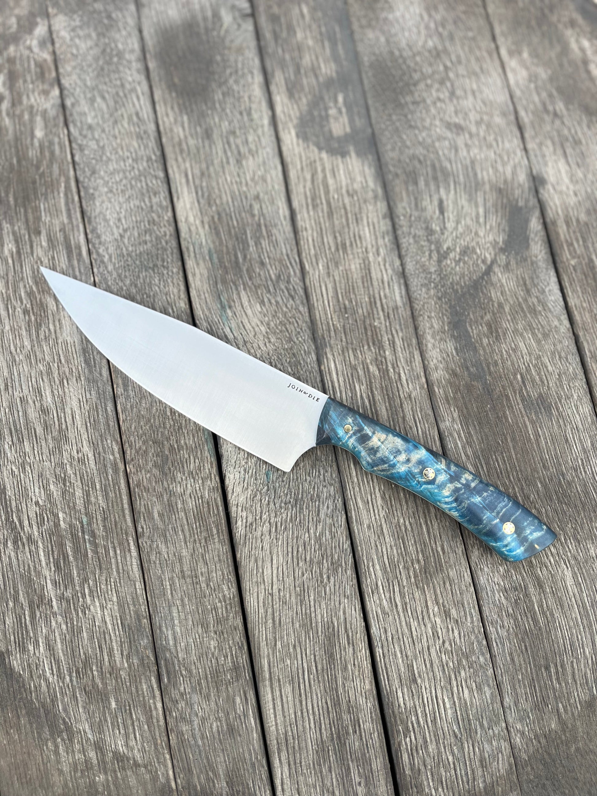 This petty chef will be your most reached for blade in the kitchen. The medium size is more convenient for most cutting tasks. The stainless alloy is Nitro-V which has the addition of nitrogen and vanadium to help with hardness and toughness. 6” cutting edge, 10 1/2” overall.
