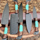 Each knife in this knofe set is handmade, so slight variations in wood grain, resin patterns, and blade finish make every piece one-of-a-kind