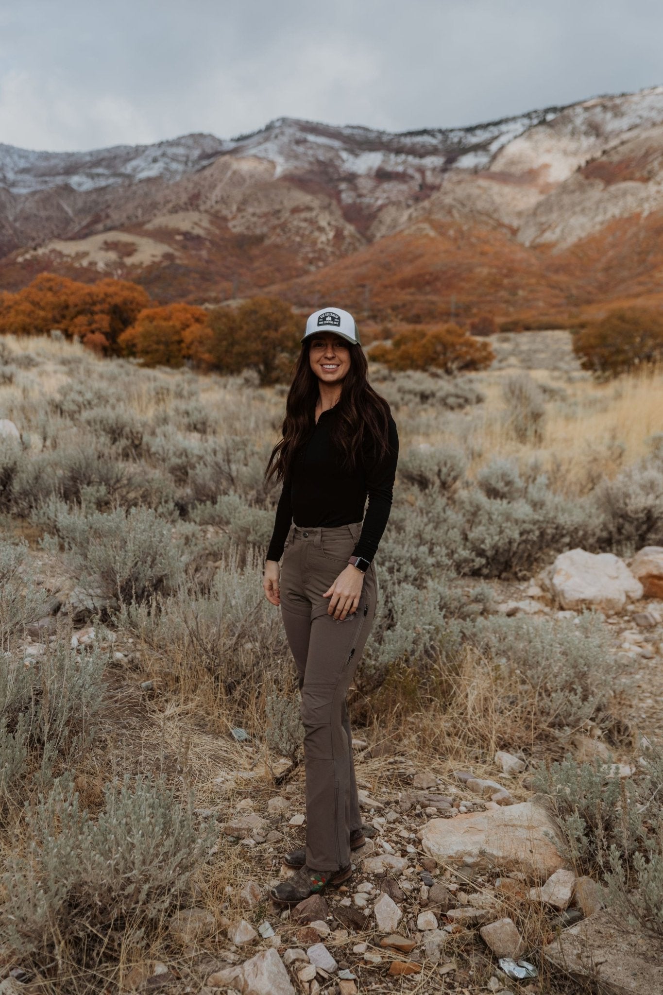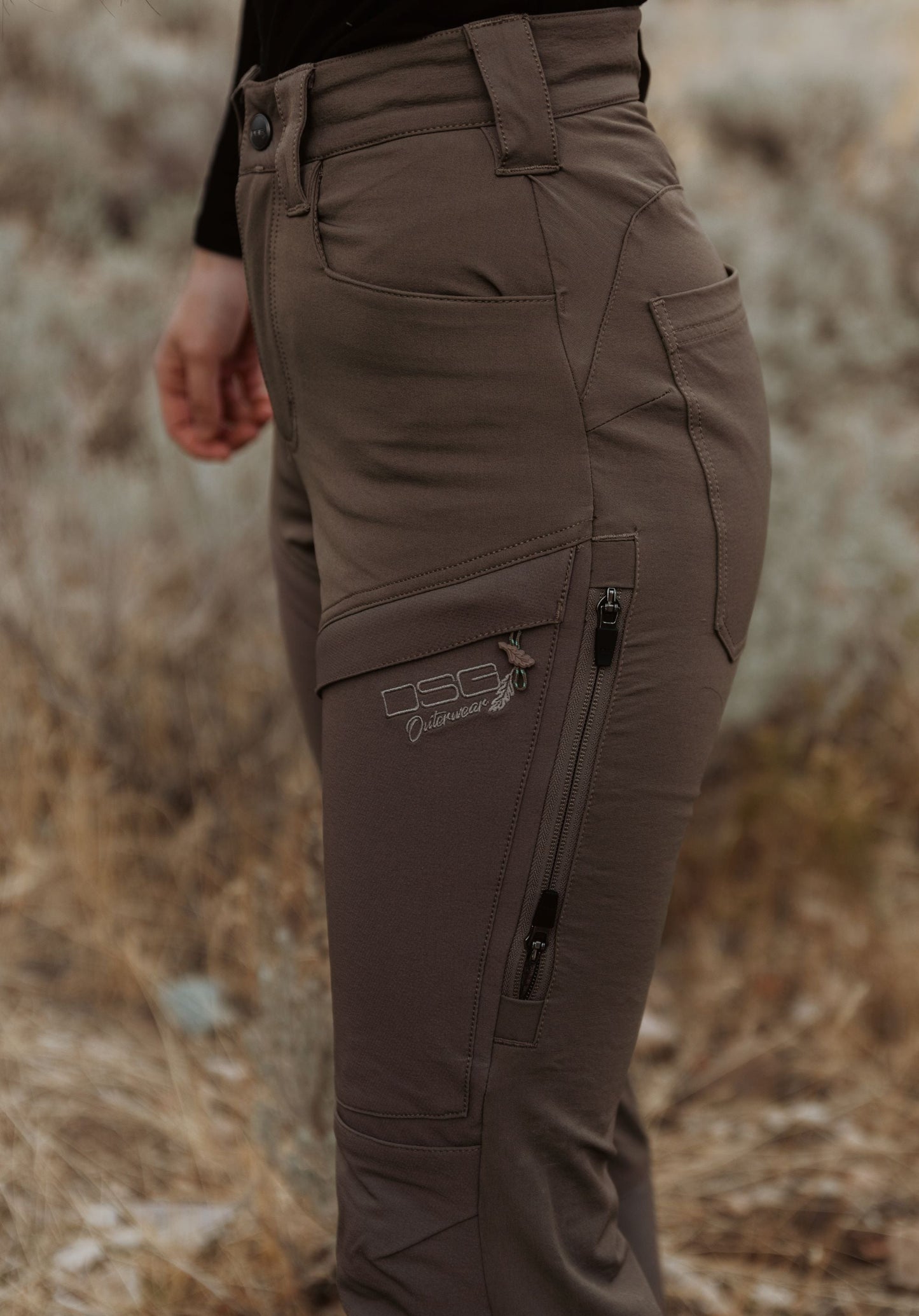 These pants are some of the most versatile pants we’ve created because of the features and the size variety they offer. The Kortni pants are made of a Nylon/Spandex 4 way stretch fabric, making them durable and comfortable at the same time. While the abrasion paneling in the front and back make the pant thicker, there are 2-way side zippers on the thighs for ventilation. The waist contains an extra wide belt loop to accommodate a snugger fit, and the crotch is gusseted to allow for better mobility. The rear darts help with improved fit, and the knee darts offer good flexibility. Six pockets allow for plenty of storage, with 2 normal front pockets, 2 back pockets and 2 zippered pockets on the thighs. At the base of the pants, there are side zippers to accommodate a variety of hunting boots that can be worn. To top off all these amazing features, the Kortni pant comes in petite, regular, and tall lengths.
