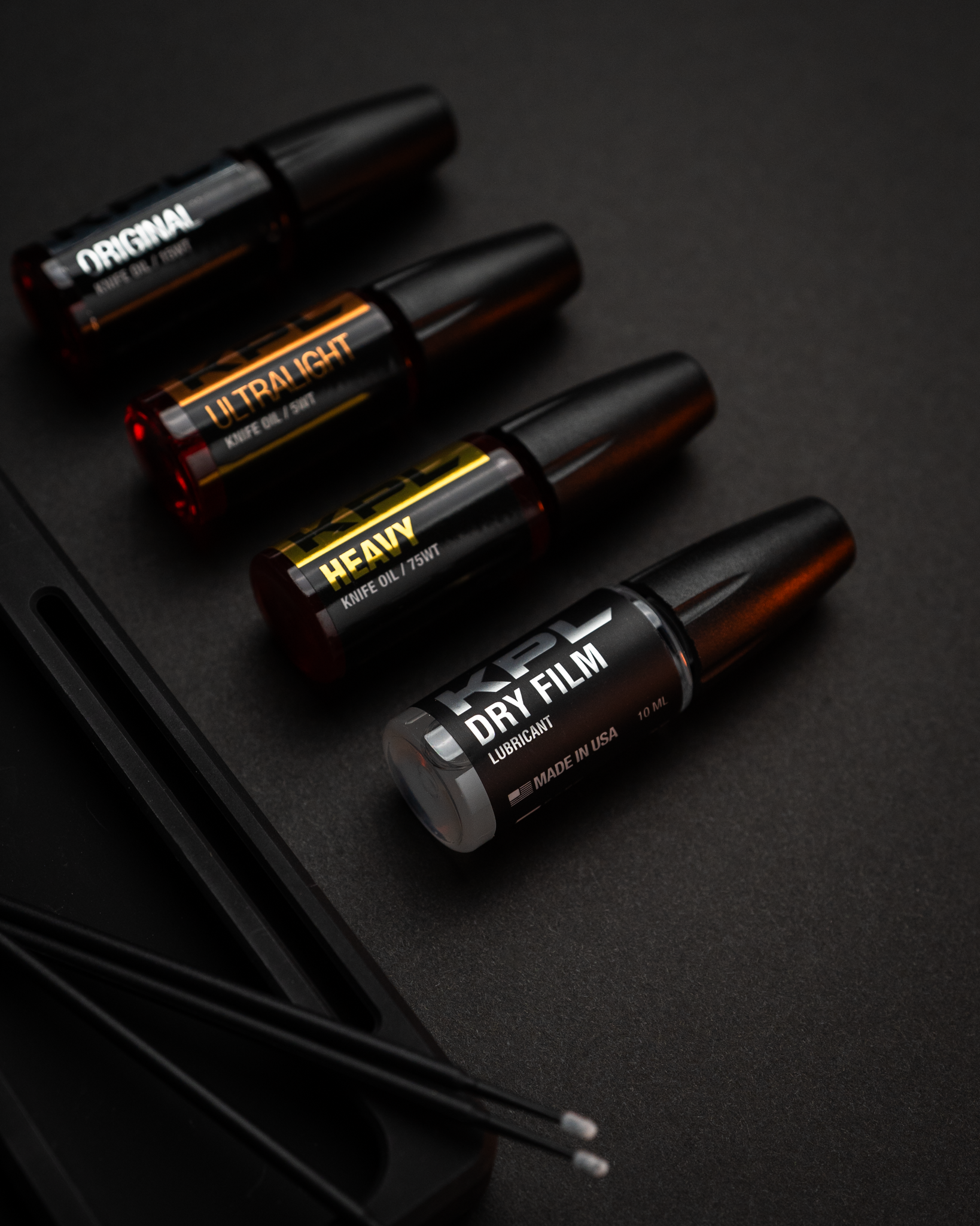 KPL’s Quad Combo Pack includes each KPL lubricant product - (5WT, 15WT, 75WT and Dry Film). Each KPL product is made for use in knives anywhere ultimate long-lasting smoothness is a must. Knife Pivot Lube Knife Oils keep dirt, metal particles, and grit in suspension™ so they don't cause grinding and premature wear.