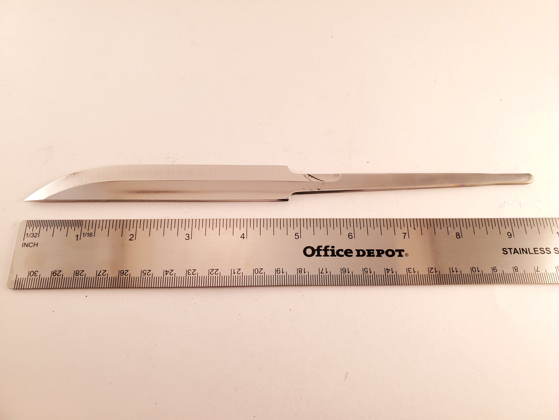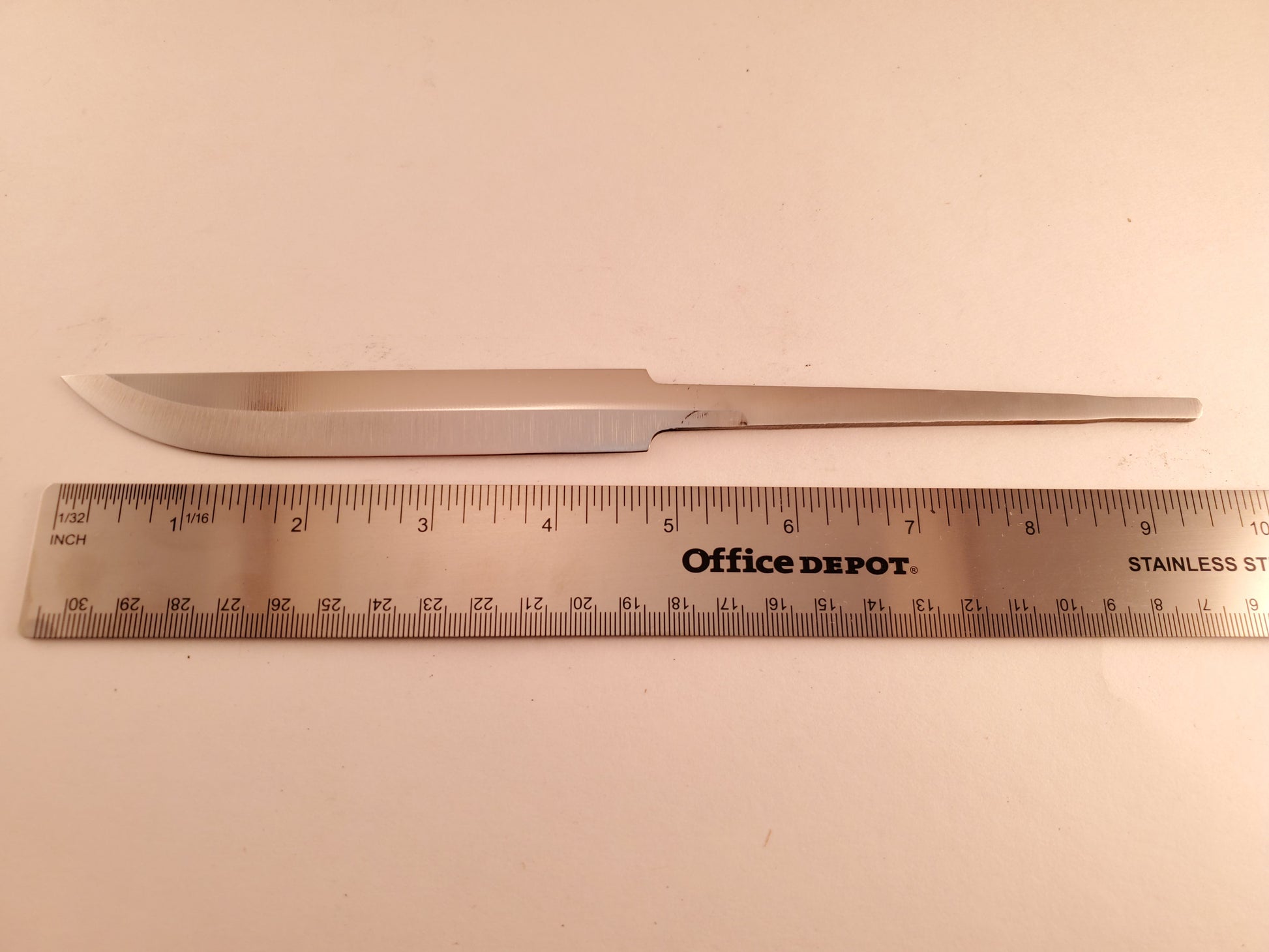 Lauri-carving-125-stainless; (125x20x3.25mm), a longer puukko blade in stainless. The blade is about 5" long, 33/4" wide and .130" thick. The tang is about 4 1/2" long, and 1/2" wide at the base.Link to 15x22x3 Shaped - Smallest possible bolster to fit this blade