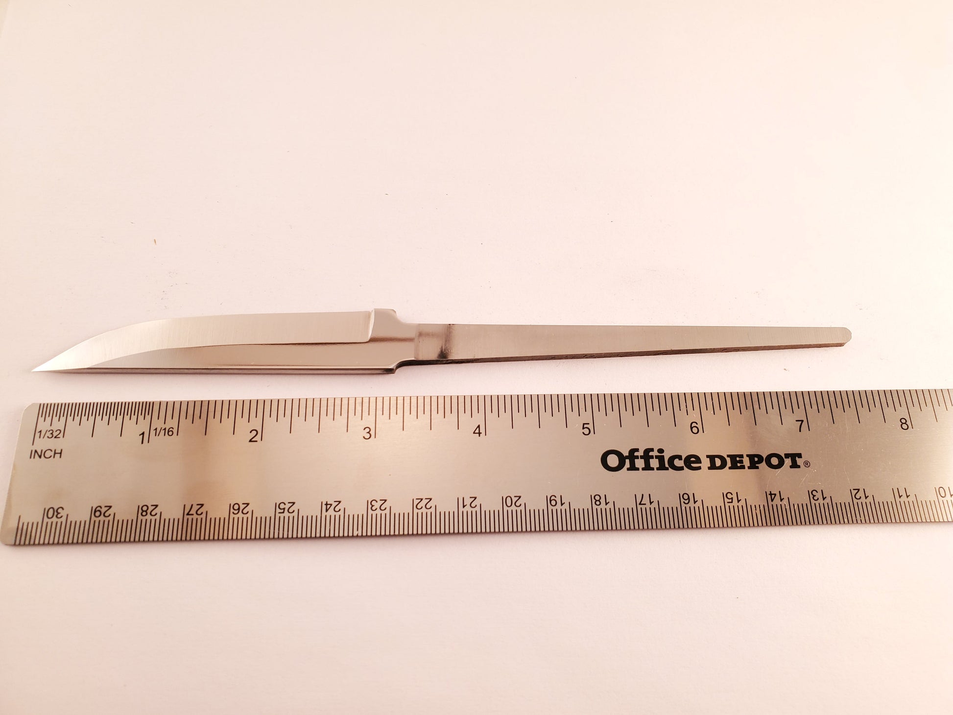 Lauri-carving-84-stainless With Ricasso; (84x17/15x3.25mm), has a slight taper, which I think makes the blade a bit more graceful. The blade is about 3 5/16" long, 5/8" wide at the base, and.130" thick. The tang is about 4 3/8" long.Best paired fittings below