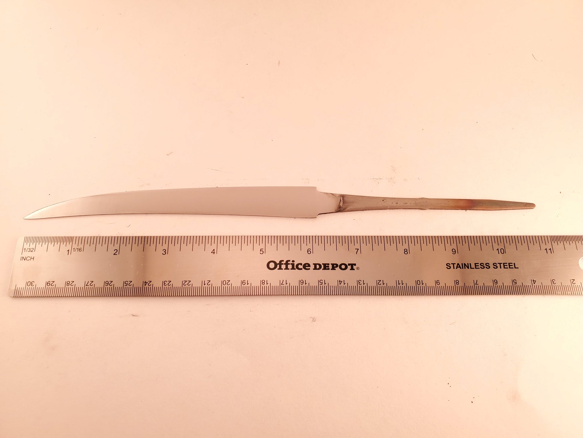 Lauri fillet 160; (160x20x1.3mm), a fillet blade in the more flexible Finnish tradition. The blade is about 6 1/4" long, 3/4" wide at the base, and only .041" thick. The tang is about 4 5/8".