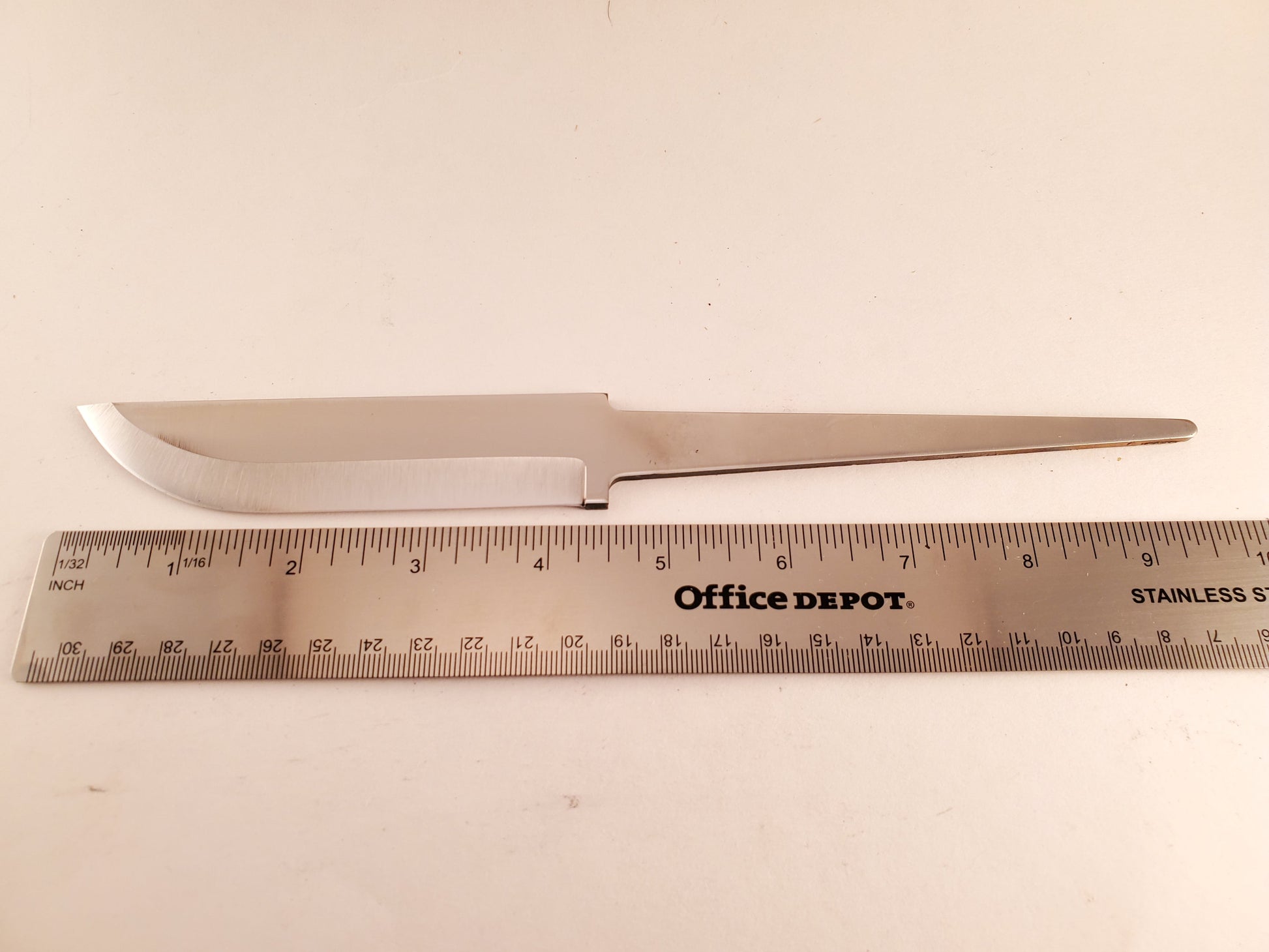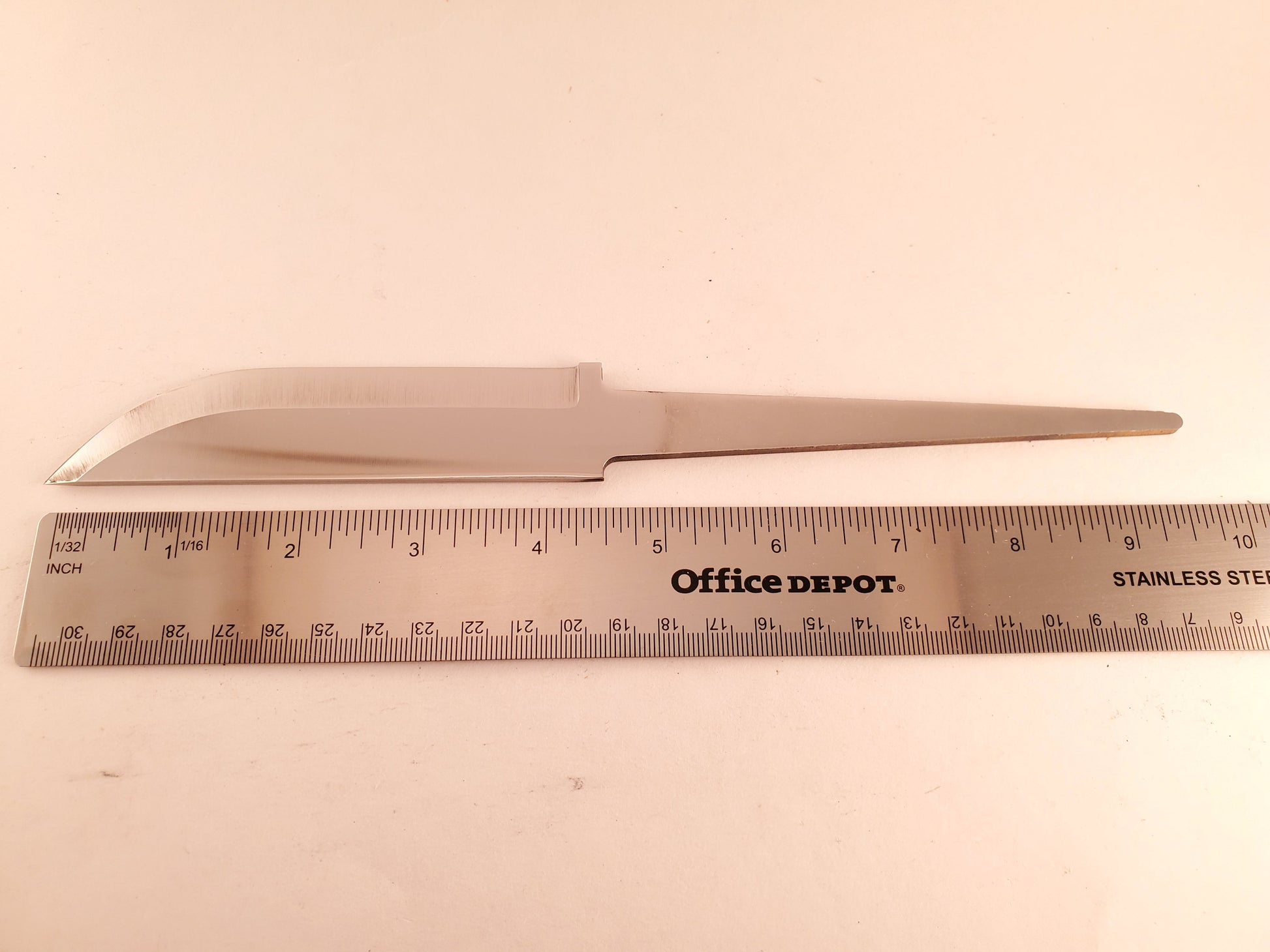 lauri-little-leuku-120-stainless with Ricasso; (120*27*3.25mm), is a longer working blade in stainless. It's about 4 1/2" long, 1 1/16" wide and.130" thick. The tang is about 5" long.